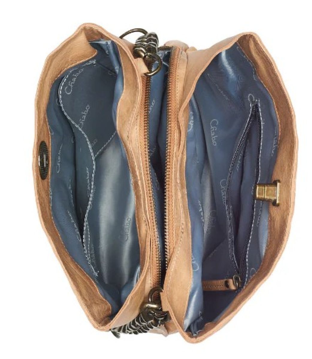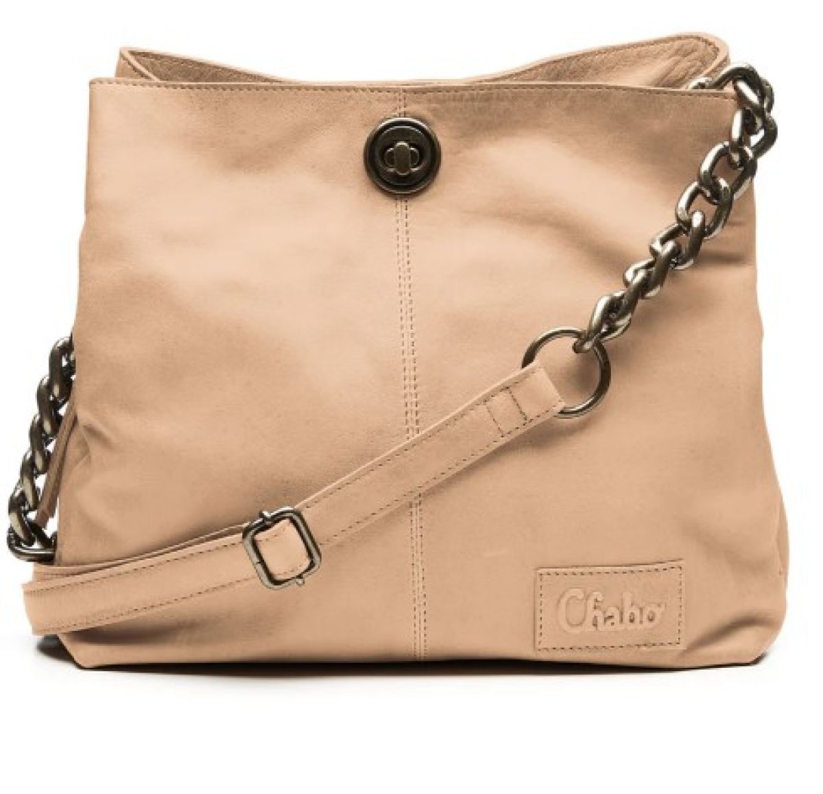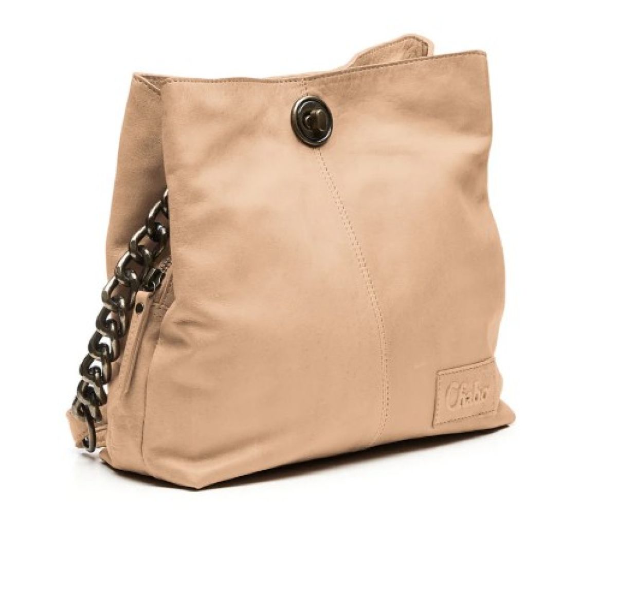 Chabo bags artikel Chain small in sand kleur is een beige lederen handtas. De schoudertas is een echte eye-catcher dankzij de antique brass schakels en elegante draaisluiting en verstelbare riem. De handtas heeft drie hoofdvakken, waarvan de middelste afsluitbaar is. Het achterste vak bevat een extra ritsvakje voor waardevolle spullen, terwijl het voorste vak is voorzien van een insteekvak – ideaal voor je telefoon of sleutels. Zo blijven al je essentials overzichtelijk opgeborgen. De Chabo ’s worden met zorg op een plantaardige manier gelooid en gekleurd, zonder het gebruik van schadelijke stoffen, dus volnerf leer. Afmetingen: 25 x 24 x 8 cm. Koop Chabo lederen handtassen in onze lederwarenwinkel regio Aalst Ninove Geraardsbergen.