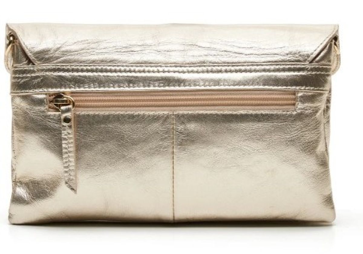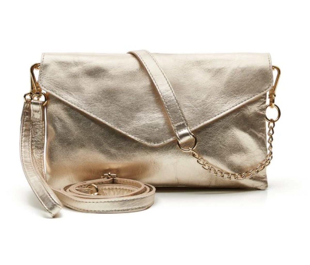 De Chabo Rio Party clutch light gold is een elegante, compacte schoudertas met een metallic gouden afwerking. Draag de Party Clutch op drie manieren – met de verstelbare schouderband, het kettinghengsel, of de prachtige polsband. Met afmetingen van 24 x 16 x 2.5 cm is deze tas ideaal voor dagelijks gebruik, zonder dat het je look overbelast. De tas is vervaardigd van hoogwaardig leer. De envelopflap met magneetsluiting geeft de tas een verfijnde look, terwijl de ritssluiting onder de flap je spullen veilig houden. De Chabo lederen handtassen in onze lederwarenwinkel regio Aalst Ninove Geraardsbergen.