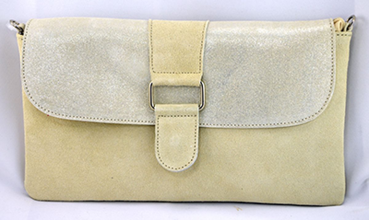 Beige - crème + zilver kleur nubuck handtas of clutch of pochette van het merk DILINI.