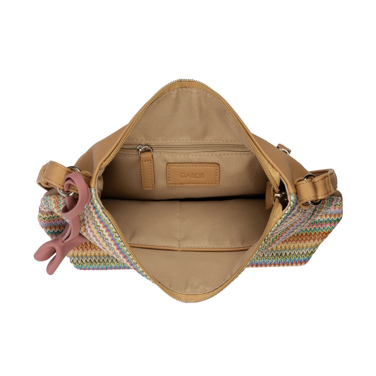 Gabor tas model 012396 Anisa cross bag is een handtas in multicolor geweven textiel vooraan en achteraan afgewerkt met beige imitatieleder De Gabor handtas heeft een vaste, verstelbare riem gemakkelijk over de schouder kan hangen of crossover kan gedragen worden. De handtas heeft binnenin 1groot vak en 2 kleinere vakjes. Achteraan is nog 1 extra vak aanwezig. Afmetingen : 24 x10 x24 cm. Gabor handtassen vindt men in de regio Aalst, Ninove, Geraardsbergen en Liedekerke of men kan online bestellen op onze webshop.