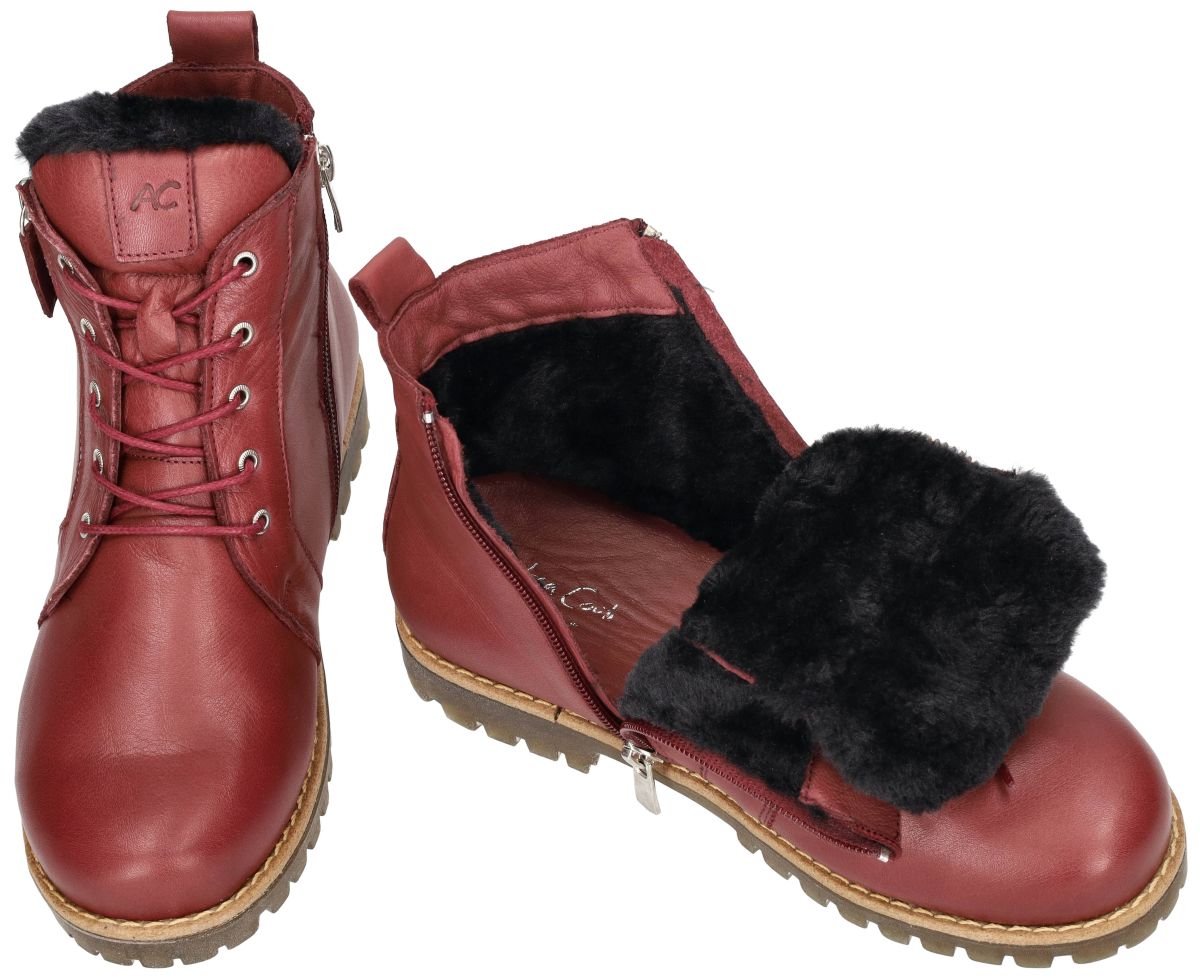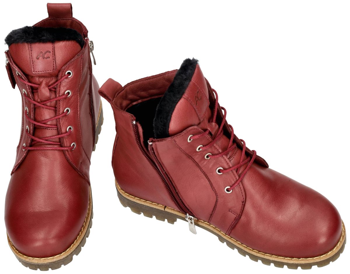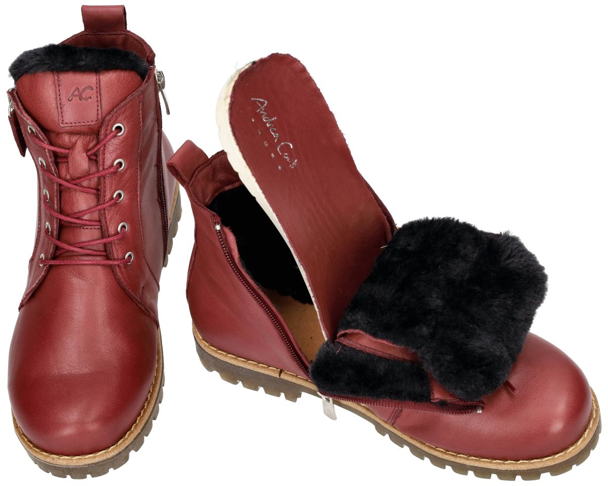 Andrea Conti 0346060 dames veterboots – stoer en comfortabel in bordeaux. De Andrea Conti veterboots 0346060 uit de nieuwe herfst/wintercollectie combineren een stoere look met het gekende comfort van zacht leder. Uitgevoerd in soepel en mals bordeaux leder (kleur burgund), sluiten deze boots perfect aan rond de voet en voelen ze aangenaam aan, zelfs bij dagelijks gebruik. Binnenin zorgen de warme wollen voering en het uitneembare voetbed voor een behaaglijk gevoel tijdens koude dagen. Dankzij de ritsen aan beide zijden van de schacht is instappen kinderspel, terwijl de vetersluiting zorgt voor een perfecte pasvorm en extra steun. De stevige rubberen zool met een uitgesproken diep profiel biedt uitstekende grip en stabiliteit, ideaal voor herfst- en winterweer. Dit maakt deze boots niet alleen modieus, maar ook functioneel en betrouwbaar. Wat deze Andrea Conti boots extra aantrekkelijk maakt, is hun consumentvriendelijke prijs – hoogwaardige materialen en praktisch design voor een verrassend toegankelijke prijs. Deze Andrea Conti bordeaux rode veterboots zijn de perfecte mix van stoer design, praktisch comfort en warme bescherming – een ideale keuze voor wie er deze winter stijlvol én zorgeloos op uit wil trekken. Andrea Conti schoenen en laarsjes kan men kopen in onze schoenenwinkel regio Aalst, Ninove, Geraardsbergen, Zottegem, Liedekerke of online bestellen op onze webshop.