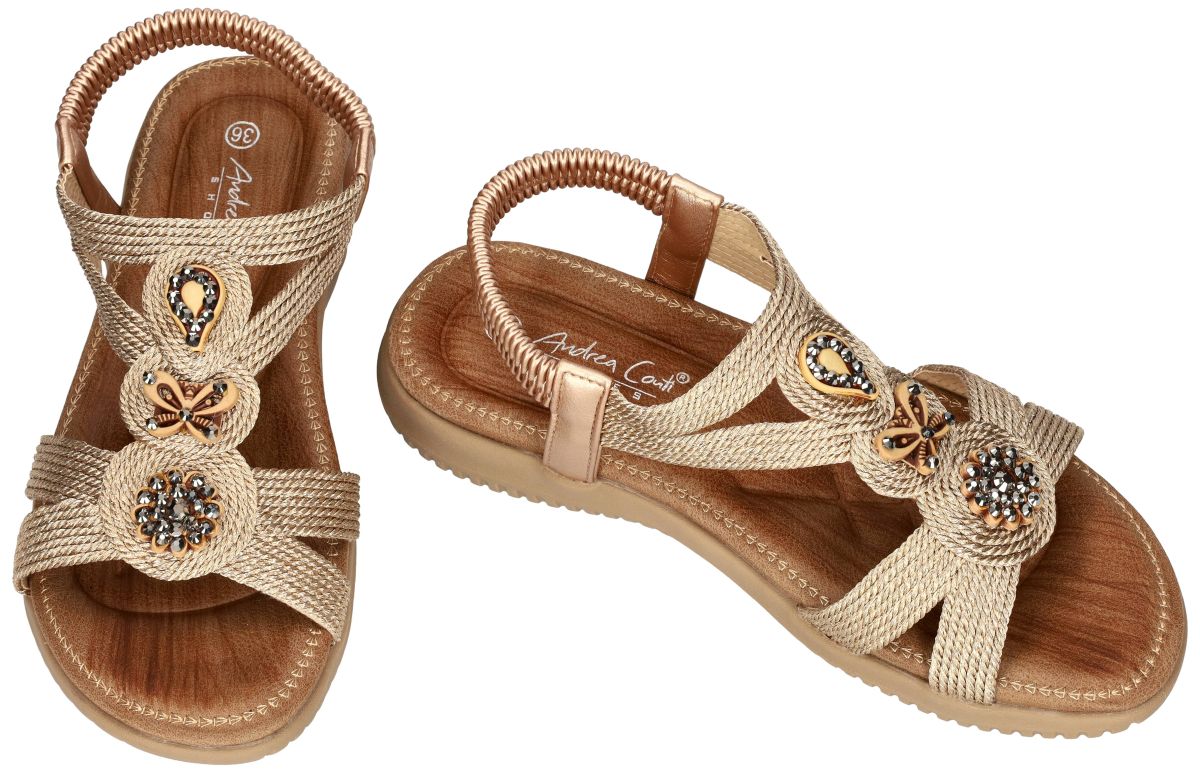 Geef uw zomerse look een elegante upgrade met deze rijkelijk gedecoreerde platte sandalen van Andrea Conti, artikel 1541004 in de uitvoering rosegold. De fijne bandjes in glanzend raffia vormen een sierlijk geheel en zijn centraal afgewerkt met decoratieve elementen bezet met glinsterende zwarte strass, wat zorgt voor een luxueuze en vrouwelijke uitstraling. Het kussenzachte voetbed biedt aangenaam draagcomfort, terwijl de stevige, stugge zool garant staat voor stabiliteit en ondersteuning bij elke stap. De elastische band achter de enkel zorgt voor een vlotte instap en een perfecte aansluiting rond de voet. De warme rosegold tint gecombineerd met het verfijnde vlechtwerk en de subtiele glans maakt deze sandaal ideaal voor zowel dagelijks gebruik als zomerse feestmomenten. Een echte blikvanger die comfort en elegantie moeiteloos samenbrengt. Andrea Conti schoenen vindt men in onze schoenenwinkel regio Aalst, Ninove, Geraardsbergen, Zottegem, Liedekerke of kan men online bestellen op onze webshop.