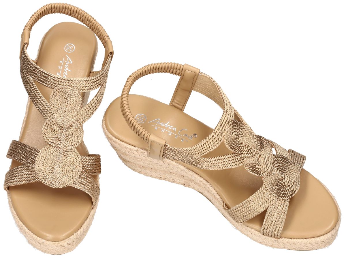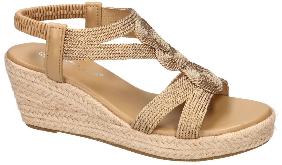 Straal zomerse elegantie uit met deze sleehak sandalen van Andrea Conti, artikel 1541033 in de uitvoering champagner. De verfijnde upper in glanzend champagnekleurig raffia geeft deze sandaal een luchtige, luxueuze uitstraling die perfect past bij zowel casual als feestelijke outfits. De comfortabele plateauzool van 3 cm loopt vloeiend over in een sleehak van 7 cm, waardoor de hiel effectief 5 cm wordt gelift. Dit zorgt voor een mooie houding zonder in te boeten op draagcomfort. De sleehak is stijlvol afgewerkt met espadrille vlechtwerk, wat het geheel een zomerse en natuurlijke look geeft. De elastische hielband garandeert een vlotte instap en een goede pasvorm rond de voet. Het zachte voetbed draagt bij aan langdurig comfort. Een ideale sandaal voor wie hoogte, elegantie en een trendy espadrille look wil combineren. Andrea Conti schoenen vindt men in onze schoenenwinkel regio Aalst, Ninove, Geraardsbergen, Zottegem, Liedekerke of kan men online bestellen op onze webshop.