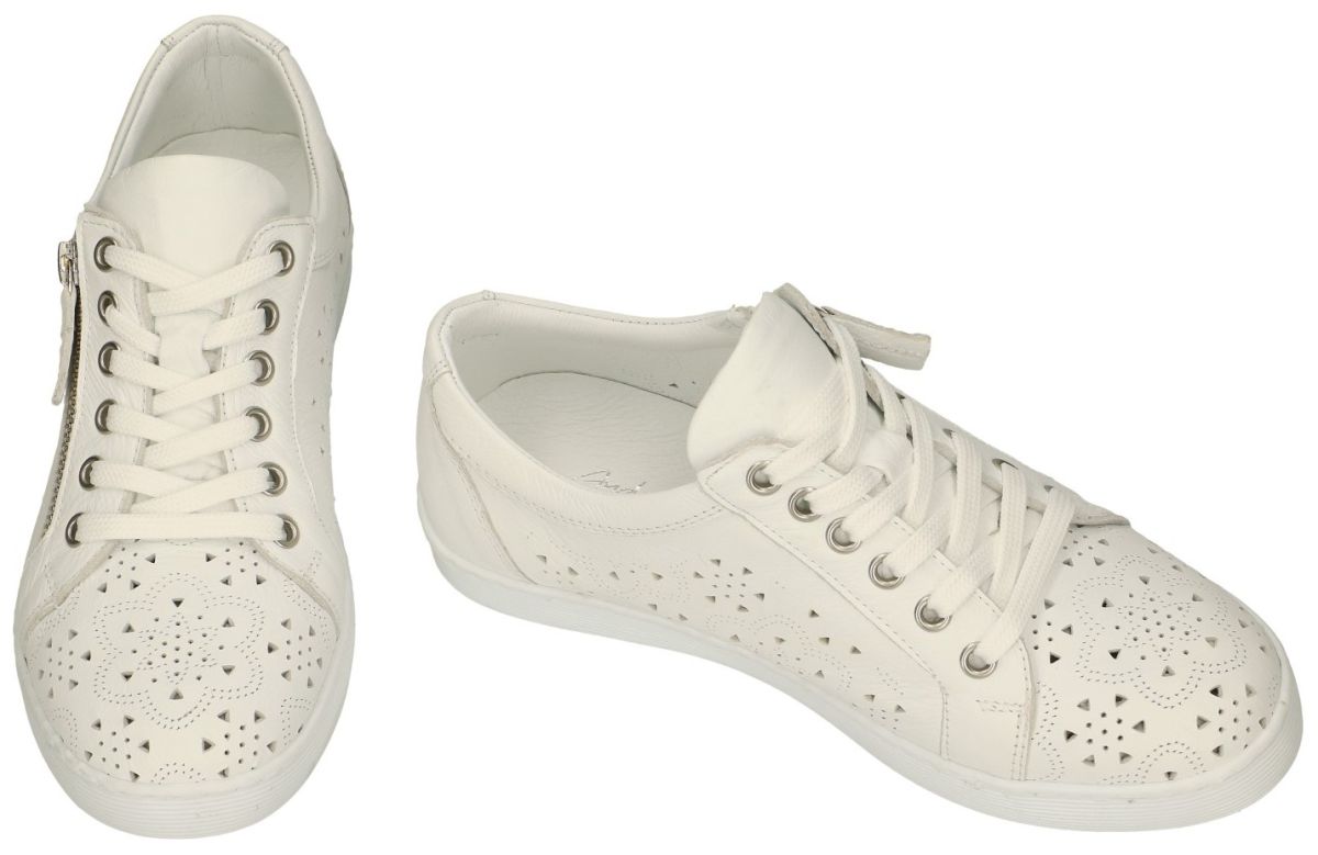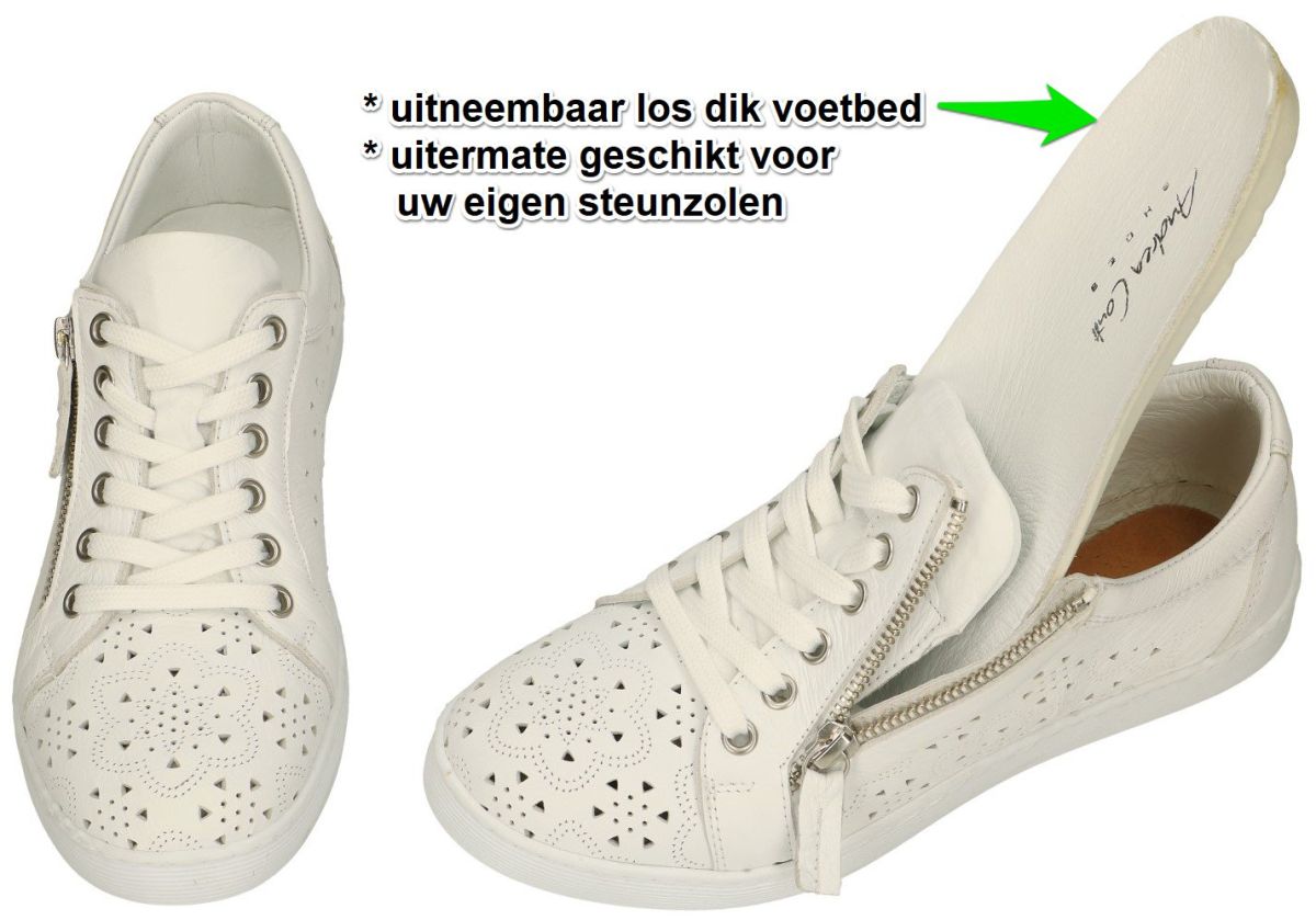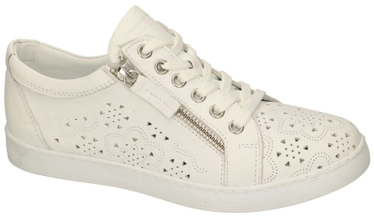 Andrea Conti artikel/model 0347107-001 weiß zijn witte lederen sneakers of sportieve veterschoentjes uit de nieuwe lente/zomer2024 collectie van het Spaanse schoenenmerk Andrea Conti. Deze platte damessneakers van Andrea Conti zijn uitgevoerd in wit met een patroon geperforeerd zacht natuurlijk gelooid chroomvrij leder zowel aan de buitenzijde als de binnenvoering. Deze lage platte sneakertjes zijn voorzien van zowel rits als veters. Samen met het dik uitneembaar met leder bekleed voetbed staat dit garant voor een uitermate comfortabel draaggevoel en zijn deze veterschoenen ook zeer geschikt om uw eigen steunzolen in te plaatsen. Deze vrouwen sneakers staan op een dikke platte rubber loopzool met een grip-vast profiel. Andrea Conti schoenen en laarsjes kan men kopen in onze schoenenwinkel regio Aalst, Ninove, Geraardsbergen, Zottegem, Liedekerke of online bestellen op onze webshop.