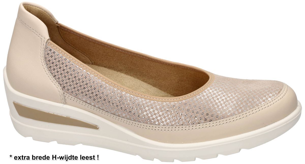 Ara Zürich 2.0 – Comfortabele wedge-ballerina’s met een extra brede H-wijdte. De Ara Zürich 2.0 is een stijlvolle en uiterst comfortabele wedge-ballerina die perfect is voor dames met bredere of volumineuze voeten. Dankzij de H-wijdte leest biedt deze schoen extra ruimte en een optimale pasvorm zonder in te boeten op elegantie. Deze sleehak ballerina is uitgevoerd in een prachtige combinatie van beige leder en zacht taupe nubuck met een subtiele zilveren kruisjesprint. Dit samenspel van materialen en kleuren geeft de schoen een verfijnde, tijdloze uitstraling. Het innovatieve "High Soft" voetbed zorgt voor ultiem comfort en demping bij elke stap. Dit losse, zachte voetbed is uitneembaar, waardoor je eenvoudig je eigen steunzolen kunt gebruiken. De wedge zool creëert een subtiele hielverhoging van 3 cm, wat zorgt voor een comfortabele loophouding en extra stabiliteit. Dankzij de beproefde boven-constructie sluit de zoom perfect rond de voet en wreef, waardoor de schoen niet alleen stevig blijft zitten, maar ook een flatterend effect heeft. De flexibele en veerkrachtige zool absorbeert schokken en maakt deze ballerina ideaal voor dagelijks gebruik en langere wandelingen. Kies voor de Ara Zürich 2.0 en ervaar het perfecte samenspel van stijl, pasvorm en comfort – een ideale keuze voor modebewuste vrouwen die geen concessies willen doen op draaggemak! ARA schoenen kan men kopen in onze schoenenwinkel regio Aalst, Ninove, Geraardsbergen of online bestellen op onze webshop.