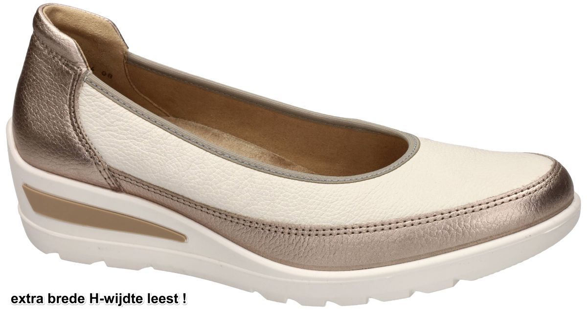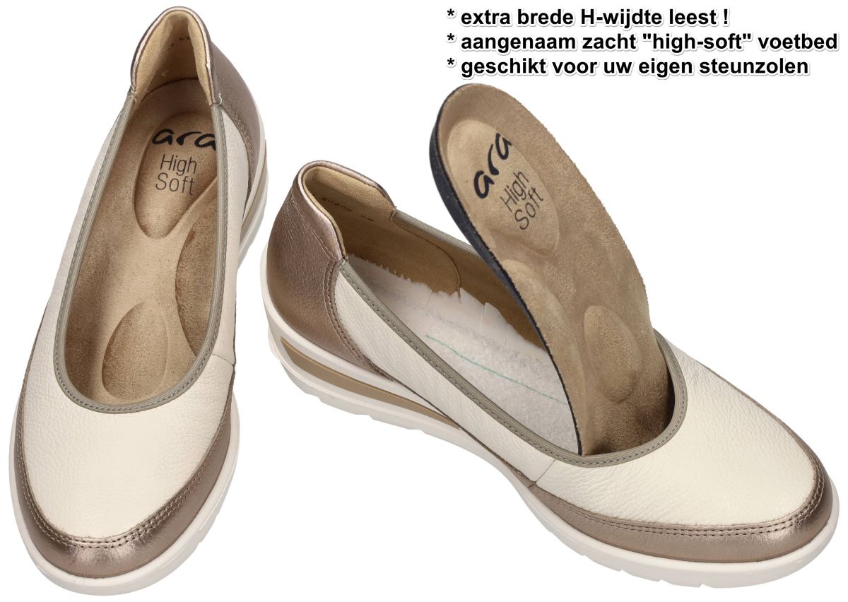 Ara Zürich 2.0 – Comfortabele wedge-ballerina’s met een extra brede H-wijdte. De Ara Zürich 2.0 is een stijlvolle en uiterst comfortabele wedge-ballerina die perfect is voor dames met bredere of volumineuze voeten. Dankzij de H-wijdte leest biedt deze schoen extra ruimte en een optimale pasvorm zonder in te boeten op elegantie. Deze sleehak ballerina is uitgevoerd in een prachtige combinatie van crème-wit leder en brons metallic. Dit samenspel van materialen en kleuren geeft de schoen een verfijnde, tijdloze uitstraling. Het innovatieve "High Soft" kussen voetbed zorgt voor ultiem comfort en demping bij elke stap. Dit losse, zachte voetbed is uitneembaar, waardoor je eenvoudig je eigen steunzolen kunt gebruiken. De wedge zool creëert een subtiele hielverhoging van 3 cm, wat zorgt voor een comfortabele loophouding en extra stabiliteit. Dankzij de beproefde boven-constructie sluit de zoom perfect rond de voet en wreef, waardoor de schoen niet alleen stevig blijft zitten, maar ook een flatterend effect heeft. De flexibele en veerkrachtige zool absorbeert schokken en maakt deze ballerina ideaal voor dagelijks gebruik en langere wandelingen. Kies voor de Ara Zürich 2.0 sleehak ballerina en ervaar het perfecte samenspel van stijl, pasvorm en comfort – een ideale keuze voor modebewuste vrouwen die geen concessies willen doen op draaggemak! ARA schoenen kan men kopen in onze schoenenwinkel regio Aalst, Ninove, Geraardsbergen of online bestellen op onze webshop.