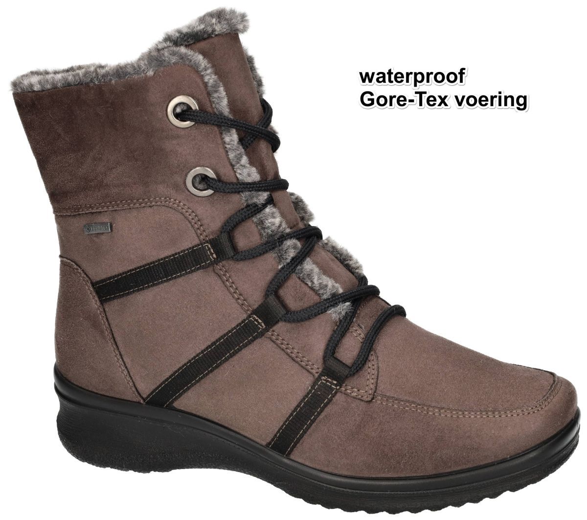 Deze ARA "München-ST-GTX" laarzen, artikelnummer 12-48554, in de versie 68H street, graphit zijn perfect voor het winterseizoen dankzij hun Gore-Tex®-technologie, die ervoor zorgt dat de laarzen waterdicht, ademend en winddicht zijn. Het bovenwerk is uitgevoerd in een taupe-bruin suède-look of velour-look textielmateriaal, wat zowel stijlvol als functioneel is. De warme voering van imitatiebont zorgt voor extra comfort en isolatie, ideaal voor koude en natte omstandigheden. Deze laarzen zijn tot 7 cm boven de hiel 100% waterdicht en hebben een praktische rits aan de zijkant, gecombineerd met een vetersluiting, waardoor ze gemakkelijk aan en uit te trekken zijn en goed aansluiten op de voet. De schacht kan wijd open en is met de veterkoord perfect regelbaar aansluitbaar aan de enkels en kuit. De zool biedt een uitstekende grip, zelfs bij nat weer, en heeft een kleine hak van ongeveer 2 cm, wat zorgt voor een comfortabele en stabiele stap. Het uitneembare voetbed maakt ze geschikt voor mensen die orthopedische inlegzolen gebruiken, en de H-wijdte biedt extra ruimte voor bredere voeten. Met een schachthoogte van 16 cm bieden deze ARA München GTX laarzen een warme bedekking en ook een goede ondersteuning rond de enkel?. De nieuwe ARA schoenencollectie vindt men in onze schoenenwinkel regio Aalst, Ninove, Geraardsbergen, Zottegem of kan men online bestellen op onze website.
