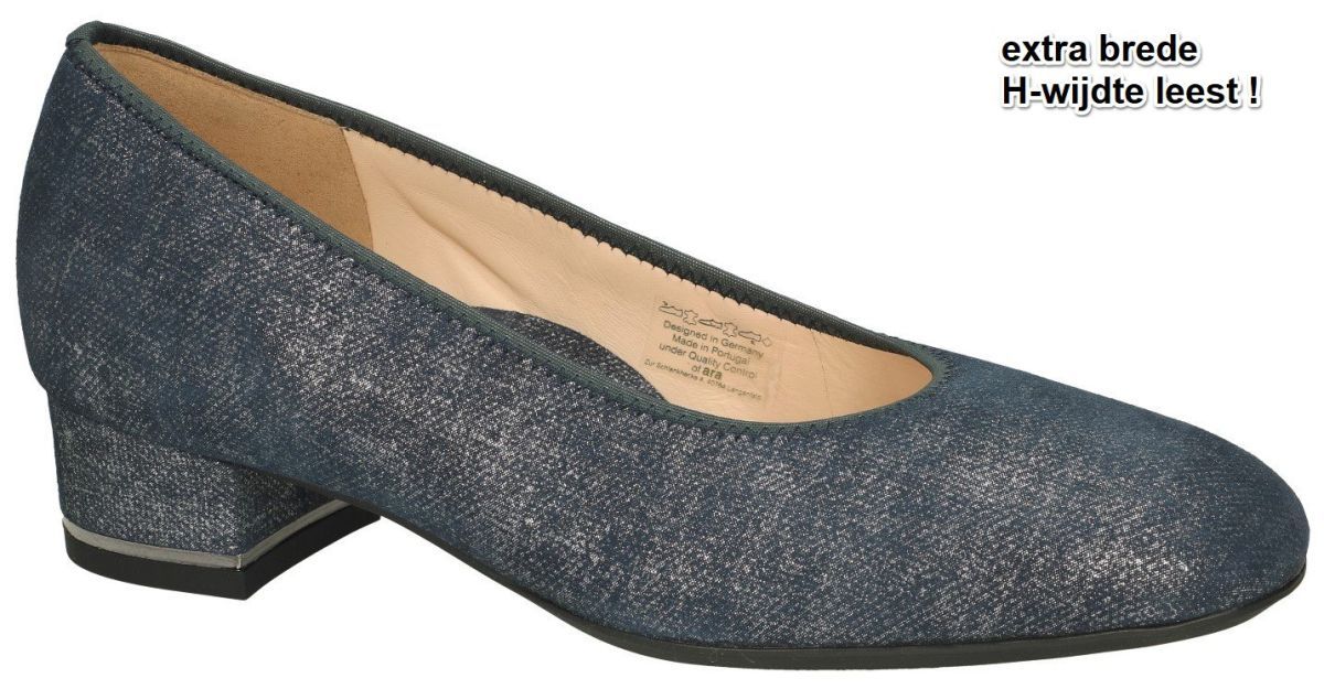 ARA artikel/model 12-121838 02H GRAZ-HIGHSOFT linokid-metallic blau zijn extra brede donkerblauwe damesschoenen comfort pumps uit de nieuwe lente/zomer 2024 schoenencollectie van de Duitse schoenenfabrikant en schoenenmerk ARA. Deze klassiek super comfortabele pump is uitgevoerd in een donkerblauw (donker jeansblauw) nubuck met een jeans-print en zilver metallic schijn onder het blauw. Deze comfortabele ARA pumps hebben blokhakje met een makkelijke hielhoogte van 3 cm en een extra brede H wijdte leest speciaal voor brede voeten. ARA extra brede H brede pumps zijn altijd op voorraad in onze schoenenwinkel regio Aalst, Ninove, Geraardsbergen, Liedekerke of kan men online bestellen op onze webshop. Is uw maat toevallig niet aanwezig, contacteer ons dan bestellen we die meteen speciaal voor jou. Mogelijk van maat 35 tot 42 halve maten inclusief.