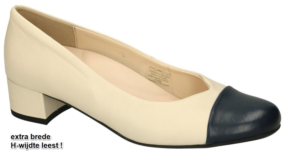 ARA artikel/model 12-35817 03H NIZZA 2.0 cervocalf blau, marmor zijn extra brede crème-wit + marineblauw damesschoenen comfort pumps uit de nieuwe lente/zomer 2023 schoenencollectie van de Duitse schoenenfabrikant en schoenenmerk ARA. Deze klassiek super comfortabele en luchtige pump is uitgevoerd in crème of ivoorwit offwhite leder met een donkerblauw leder neus. Deze comfortabele ARA pumps hebben een makkelijke hakhoogte van 3 cm en een extra brede H wijdte leest speciaal voor brede voeten en een uitneembaar uitermate zacht voetbed dat indien nodig kan vervangen worden door eigen steunzolen of gewoon weggelaten kan worden om nog extra ruimte en volume vrij te maken. ARA extra brede H brede pumps zijn altijd op voorraad in onze schoenenwinkel regio Aalst, Ninove, Geraardsbergen, Liedekerke of kan men online bestellen op onze webshop. Is uw maat toevallig niet aanwezig, contacteer ons dan bestellen we die meteen speciaal voor jou. Mogelijk van maat 35 tot 42 halve maten inclusief.