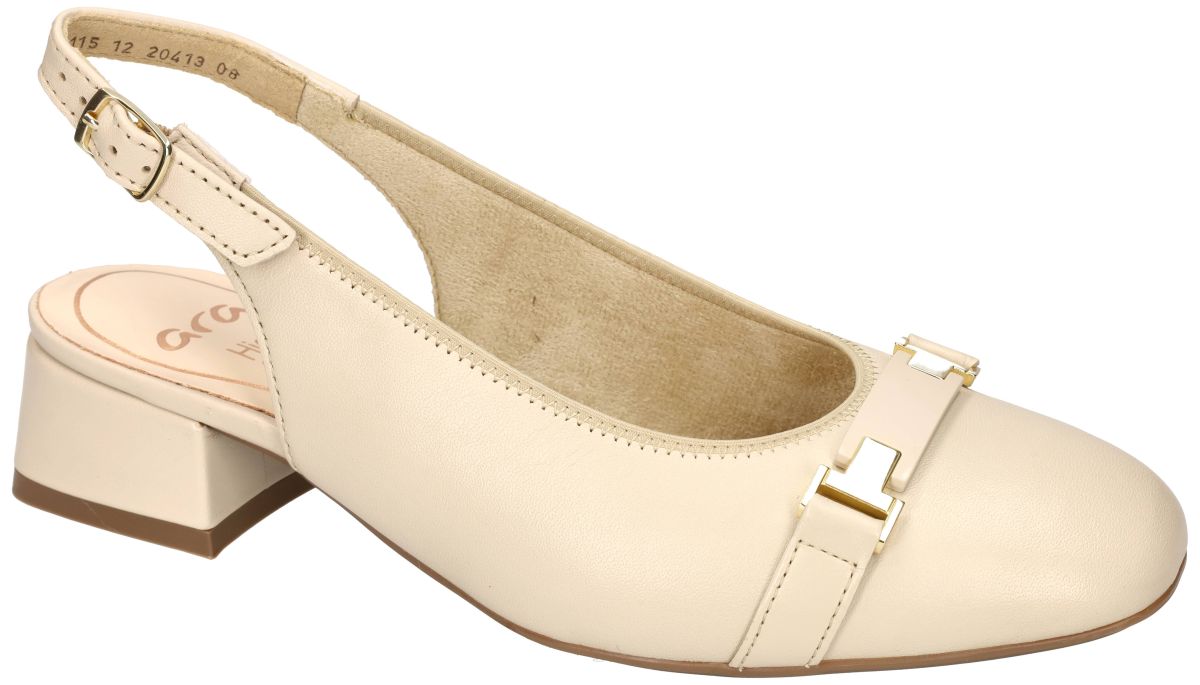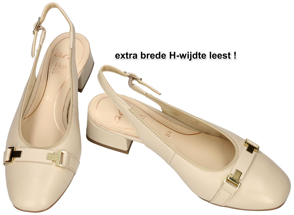 ARA artikel/model 12-20413-08 GRAZ 2.0 beach glazekid zijn extra brede crème beige kalfslederen damesschoenen comfort slingback pumps uit de nieuwe lente/zomer collectie van het schoenenmerk ARA. Deze klassiek super comfortabele slingback decolleté schoentjes zijn uitgevoerd in een fijn crème kalfleder met beklede blokhak en een decoratieve goud metaal met beige kunstof platte ketting op de neus van de schoen. Deze comfortabele ARA pumps zijn open aan de hiel met een gesp sluiting aan de enkel en hebben een blokhakje makkelijke hakhoogte van 3 cm en een extra brede H wijdte leest speciaal voor brede voeten. ARA extra brede H brede pumps zijn altijd op voorraad in onze schoenenwinkel regio Aalst, Ninove, Geraardsbergen, Zottegem, Liedekerke of kan men online bestellen op onze webshop.