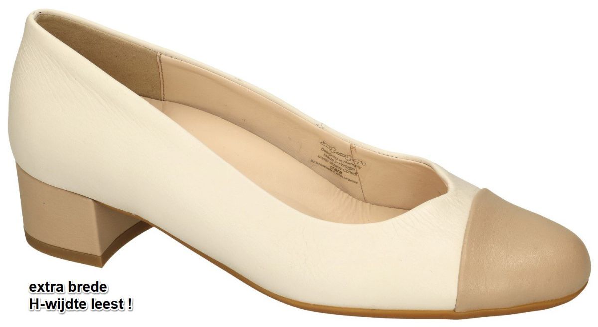 ARA artikel/model 12-35817 08H NIZZA 2.0 cervocalf sand,cream zijn extra brede crème-wit + taupe damesschoenen comfort pumps uit de nieuwe lente/zomer 2023 schoenencollectie van de Duitse schoenenfabrikant en schoenenmerk ARA. Deze klassiek super comfortabele en luchtige pump is uitgevoerd in crème of ivoorwit offwhite leder met een taupe leder neus. Deze comfortabele ARA pumps hebben een makkelijke hakhoogte van 3 cm en een extra brede H wijdte leest speciaal voor brede voeten en een uitneembaar uitermate zacht voetbed dat indien nodig kan vervangen worden door eigen steunzolen of gewoon weggelaten kan worden om nog extra ruimte en volume vrij te maken. ARA extra brede H brede pumps zijn altijd op voorraad in onze schoenenwinkel regio Aalst, Ninove, Geraardsbergen, Liedekerke of kan men online bestellen op onze webshop. Is uw maat toevallig niet aanwezig, contacteer ons dan bestellen we die meteen speciaal voor jou. Mogelijk van maat 35 tot 42 halve maten inclusief.