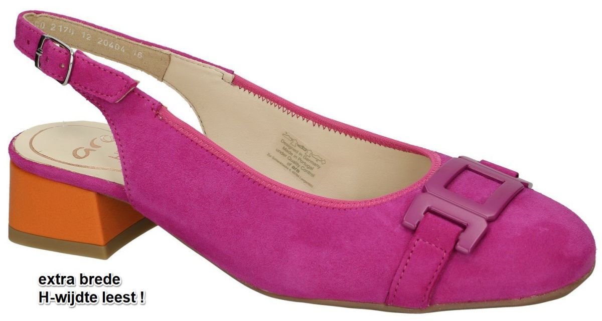 ARA artikel/model 12-20404 16H GRAZ 2.0 samtchevreau pink ambra zijn extra brede fuchsia/magenta roze nubuck damesschoenen comfort slingback pumps uit de nieuwe lente/zomer 2024 schoenencollectie van de Duitse schoenenfabrikant en schoenenmerk ARA. Deze klassiek super comfortabele slingback decolleté schoentjes zijn uitgevoerd in een zacht donker-roze fuchsia of magenta rood nubuck met een oranje hak en een decoratieve plattefuchsia ketting op de neus van de schoen. Deze comfortabele ARA pumps zijn open aan de hiel met een gesp sluiting aan de enkel en hebben een blokhakje makkelijke hakhoogte van 3 cm en een extra brede H wijdte leest speciaal voor brede voeten. ARA extra brede H brede pumps zijn altijd op voorraad in onze schoenenwinkel regio Aalst, Ninove, Geraardsbergen, Liedekerke of kan men online bestellen op onze webshop. Is uw maat toevallig niet aanwezig, contacteer ons dan bestellen we die meteen speciaal voor jou. Mogelijk van maat 35 tot 42 halve maten inclusief.