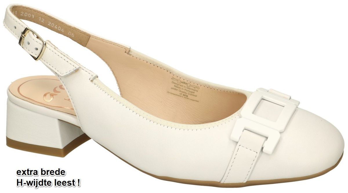 ARA artikel/model 12-20404 05H GRAZ 2.0 firenzecalf weiss zijn extra brede witte kalfslederen damesschoenen comfort slingback pumps uit de nieuwe lente/zomer 2024 schoenencollectie van de Duitse schoenenfabrikant en schoenenmerk ARA. Deze klassiek super comfortabele slingback decolleté schoentjes zijn uitgevoerd in een fijn wit kalfleder met beklede blokhak en een decoratieve witte kunstof platte ketting op de neus van de schoen. Deze comfortabele ARA pumps zijn open aan de hiel met een gesp sluiting aan de enkel en hebben een blokhakje makkelijke hakhoogte van 3 cm en een extra brede H wijdte leest speciaal voor brede voeten. ARA extra brede H brede pumps zijn altijd op voorraad in onze schoenenwinkel regio Aalst, Ninove, Geraardsbergen, Liedekerke of kan men online bestellen op onze webshop. Is uw maat toevallig niet aanwezig, contacteer ons dan bestellen we die meteen speciaal voor jou. Mogelijk van maat 35 tot 42 halve maten inclusief.