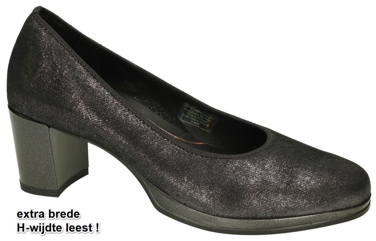 ARA artikel/model 12-22901 CANNES - 14H linokid-metallic schwarz zijn extra brede zwarte met zilver glinster damesschoenen pumps uit de nieuwe herfst/winter 2023 schoenencollectie van de Duitse schoenenfabrikant en schoenenmerk ARA. Deze elegante en stijlvolle Cannes pumps van Ara zijn vervaardigd uit glinsterend blauw nubuck hebben een extra brede H-wijdte leest speciaal voor bredere en zwaardere voeten. Door de ARA highsoft technologie zijn deze pumps super soepel en buigzaam. Het extra mals en zacht dubbel lucht gepolsterde gelkussen voetbed en de makkelijke 5 centimeter hakhoogte zorgt voor een uitermate aangenaam draagcomfort zodat men deze pumps lange dagen kan dragen alsof men pantoffel aan heeft. ARA highsoft pumps zijn altijd op voorraad in onze schoenenwinkel regio Aalst, Ninove, Geraardsbergen, Liedekerke of kan men online bestellen op onze webshop. Is uw maat toevallig niet aanwezig, contacteer ons dan bestellen we die meteen speciaal voor jou. Mogelijk van maat 35 tot 42 halve maten inclusief.