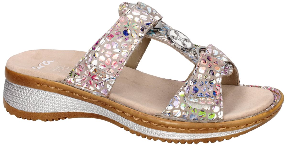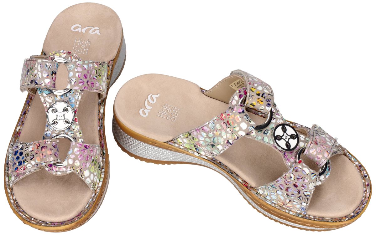 ARA artikel/model 12-29003 (06G) HAWAII 2.0 sasso konfettikid zijn grijze met veelkleurige fantasieprint damesschoenen sleehak slippers of muiltjes van het Duitse schoenenmerk en schoenenfabrikant ARA. Deze super comfortabele ara instap-slippers hebben een ruime G-wijdte leest voor de gemiddelde tot wat bredere voet en staan op een sterke antislipzool met een hielhoogte 3 cm en het voetbed is gevoerd met luchtgepolsterd zacht nubuck leder. Het bovenwerk is uitgevoerd in een beige zandkleurig nubuckleder met een glinsterende zilver schittering. De slipper kan door de klittenband sluitingen aangepast worden aan de breedte en de wreef van de voet. Ara slippers en muiltjes vindt men in onze schoenenwinkel te Denderhoutemregio Aalst, Ninove, Geraardsbergen, Zottegem en Liedekerke of kan men onlinebestellen op onze webshop.