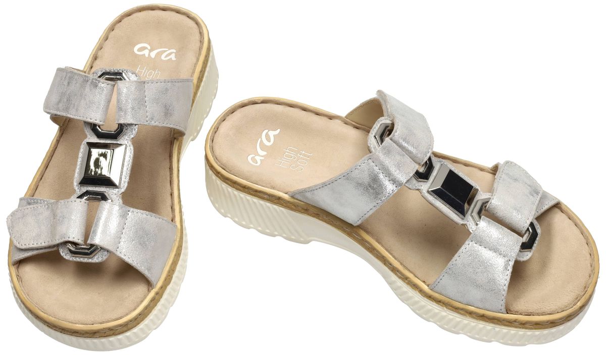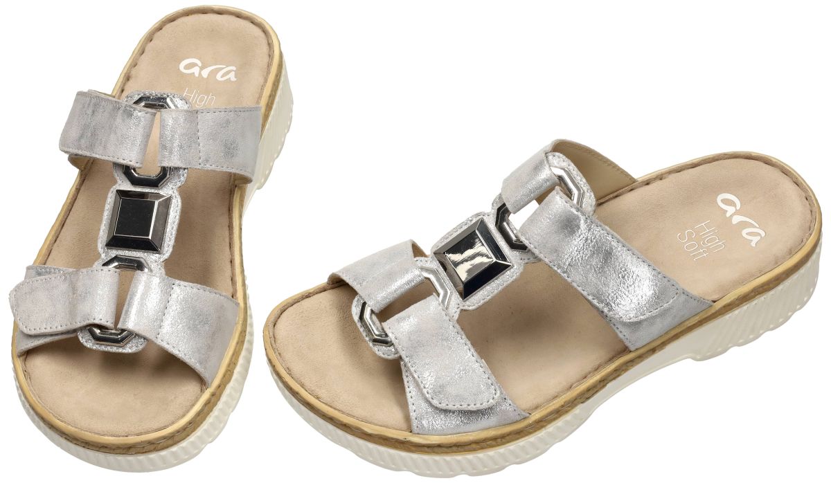 Ara Capri-S 12-39103 Dusty Nuvola-Kid – Luxueuze en comfortabele slippers in zilver glitternubuck. De Ara Capri-S 12-39103 in de betoverende kleur Dusty Nuvola-Kid combineert een modieuze uitstraling met ultiem comfort. Deze slippers zijn de perfecte keuze voor vrouwen die houden van een stijlvolle, lichte en comfortabele zomerschoen met een glamoureuze touch. Lichtgewicht en optimaal draagcomfort: Dankzij het ultralichte ontwerp voelen deze slippers heerlijk aan bij elke stap. Het HighSoft voetbed, bekleed met zacht kalfsleer, zorgt voor sublieme demping en ondersteuning, waardoor je voeten minder snel vermoeid raken. De binnenzijde is eveneens met kalfsleer gevoerd, wat een ademend en aangenaam gevoel biedt, zelfs op warme dagen. Verstelbare pasvorm voor een perfecte fit: De twee brede klittenbanden maken het mogelijk om de pasvorm gemakkelijk en nauwkeurig aan te passen aan je voet. Dit biedt extra comfort en stabiliteit, waardoor je de slippers moeiteloos de hele dag kunt dragen. Uniek en verfijnd design: De upper is uitgevoerd in zilvergrijs nubuck met subtiele schittering, wat deze slippers een exclusieve en trendy uitstraling geeft. De vierkante blinkende chromé metallic decoratie op de wreef voegt een elegante en luxueuze touch toe, perfect voor een chique en moderne look. Eigentijdse plateauzool met stevige grip: De witte plateauzool zorgt niet alleen voor een modieus accent, maar biedt ook extra stabiliteit en comfort. De witte afwerking langs de zoolrand geeft een verfijnde zomerse uitstraling, terwijl de structuur van de zool zorgt voor een veilige grip op diverse ondergronden. Een mix van elegantie en functionaliteit : Met de Ara Capri-S slippers 12-39103 in Dusty Nuvola-Kid kies je voor een modieuze, stijlvolle en uiterst comfortabele slipper. Of je ze nu draagt tijdens een zomerse wandeling, op vakantie of bij een casual-chique outfit, deze slippers geven je look altijd een luxueuze en trendy touch. Bestel nu en ervaar de perfecte mix van mode en comfort! Ara slippers en muiltjes vindt men in onze schoenenwinkel te Denderhoutemregio Aalst, Ninove, Geraardsbergen, Zottegem en Liedekerke of kan men onlinebestellen op onze webshop van maat 35 tot maat 43