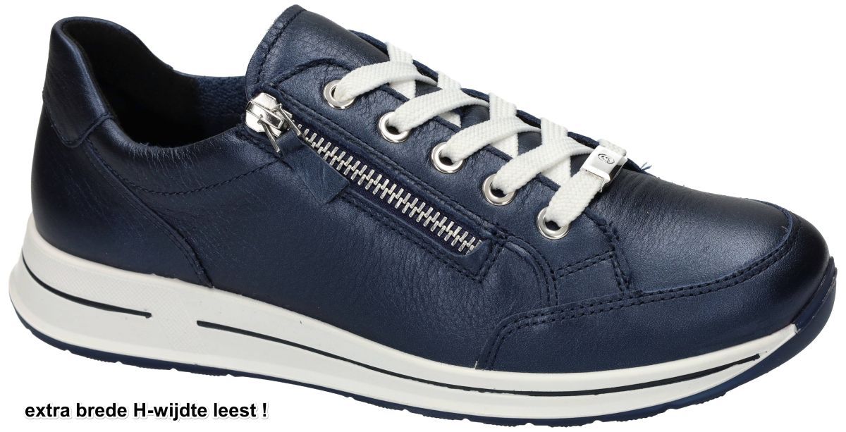 ARA artikel/model 12-54801 - 13H OSAKA 2.0 Gauchosoft-metallic nightblue zijn donker blauw metallic damesschoenen extra brede luxury sneakers of sportieve veterschoenen uit de nieuwe lente/zomer 2025 collectie van het Duitse schoenenmerk en schoenenfabrikant ARA. Deze super comfortabele ara sneakers hebben een extra brede H-wijdte leest en zijn voorzien van een los uitneembaar voetbed dat kan omgewisseld worden met eigen steunzolen. Het superzacht highsoft los voetbed of binnenzool kan worden verwijderd zodat indien noodzakelijk extra volume kan worden vrijgemaakt of voor het plaatsen van eigen steunzolen. Deze sneaker staat op een schokbestendige en veerkrachtige luchtpolster loopzool en zorgt voor een uitermate aangename stap en loopcomfort. De Ara Osaka 2.0 is een damessneaker die comfort en stijl harmonieus combineert. Dit model is ontworpen met hoogwaardige materialen en innovatieve technologieën om een optimale draagervaring te bieden. Het bovenwerk is vervaardigd van glanzend nachtblauw metallic leder, wat zorgt voor een luxe uitstraling en duurzaamheid. De technologie van de Ara Osaka 2.0 sneakers combineert een zacht bovenmateriaal met een comfortabele zool, wat resulteert in een dempend effect en vermindering van vermoeidheid bij langdurig dragen. De sneaker is voorzien van een uitneembare binnenzool, waardoor het mogelijk is om persoonlijke inlegzolen te gebruiken voor extra ondersteuning. De binnenvoering bestaat uit badstof op basis van bamboevezels, wat zorgt voor een ademend en vochtabsorberend effect, waardoor een aangenaam voetklimaat behouden blijft. Uitgerust met zowel veters als ritssluiting biedt de Osaka 2.0 een gemakkelijke instap en aanpasbare pasvorm. SCHOENEN KARO Zool: De flexibele rubberen zool met een hakhoogte van ongeveer 3 cm zorgt voor een goede demping en grip tijdens het lopen. Dit model is beschikbaar in een H-leest, wat betekent dat het geschikt is voor de bredere voet en extra comfort biedt. Deze sneaker is ideaal voor dagelijks gebruik en kan gemakkelijk gecombineerd worden met verschillende outfits, variërend van casual tot sportief. Ara comfortschoenen en sneakers vindt men in onze schoenenwinkel te Denderhoutemregio Aalst, Ninove, Geraardsbergen, Zottegem en Liedekerke of kan men onlinebestellen op onze webshop van maat 35 tot maat 43