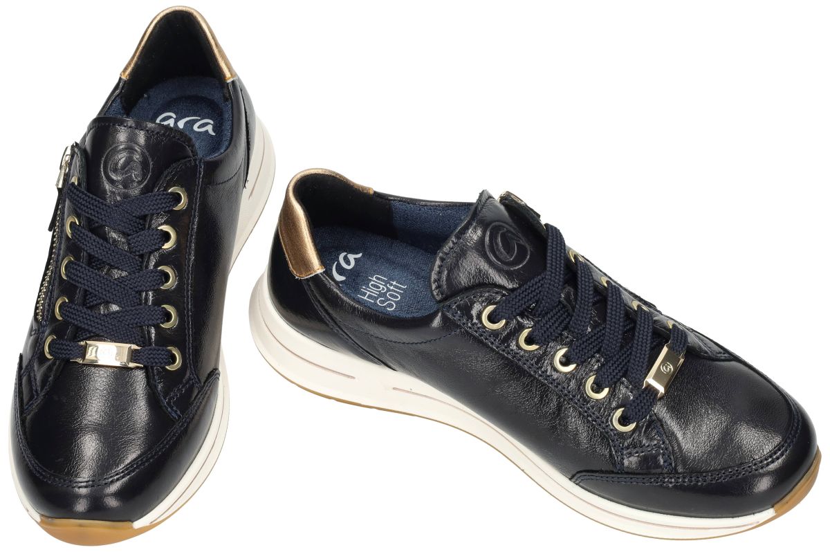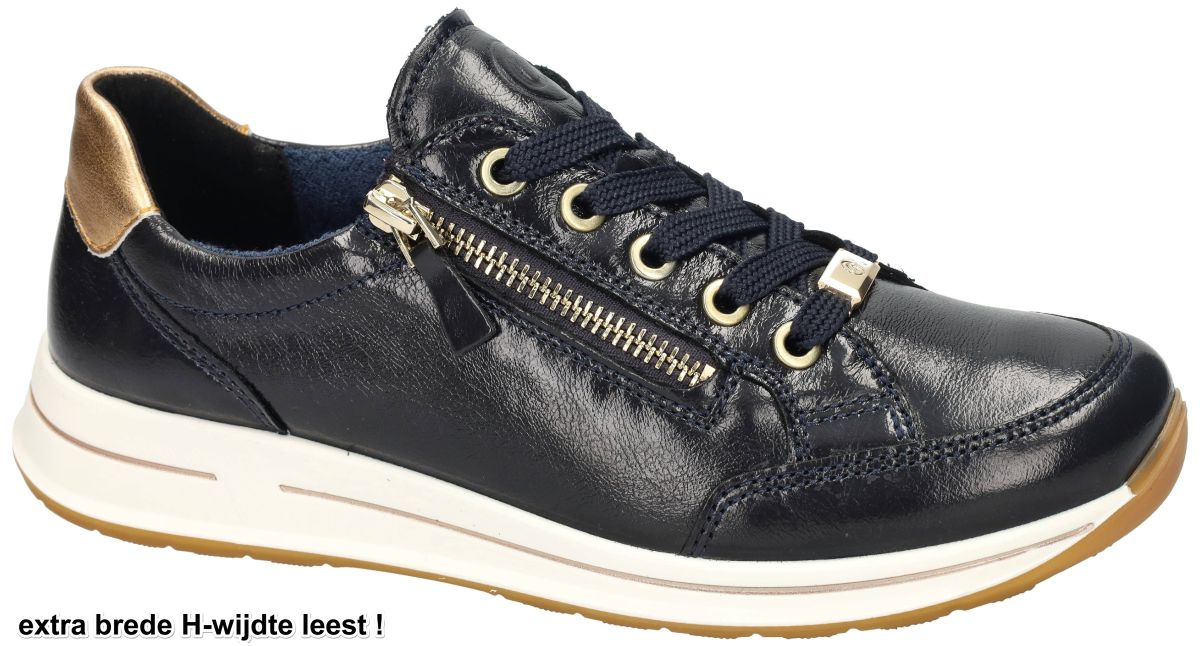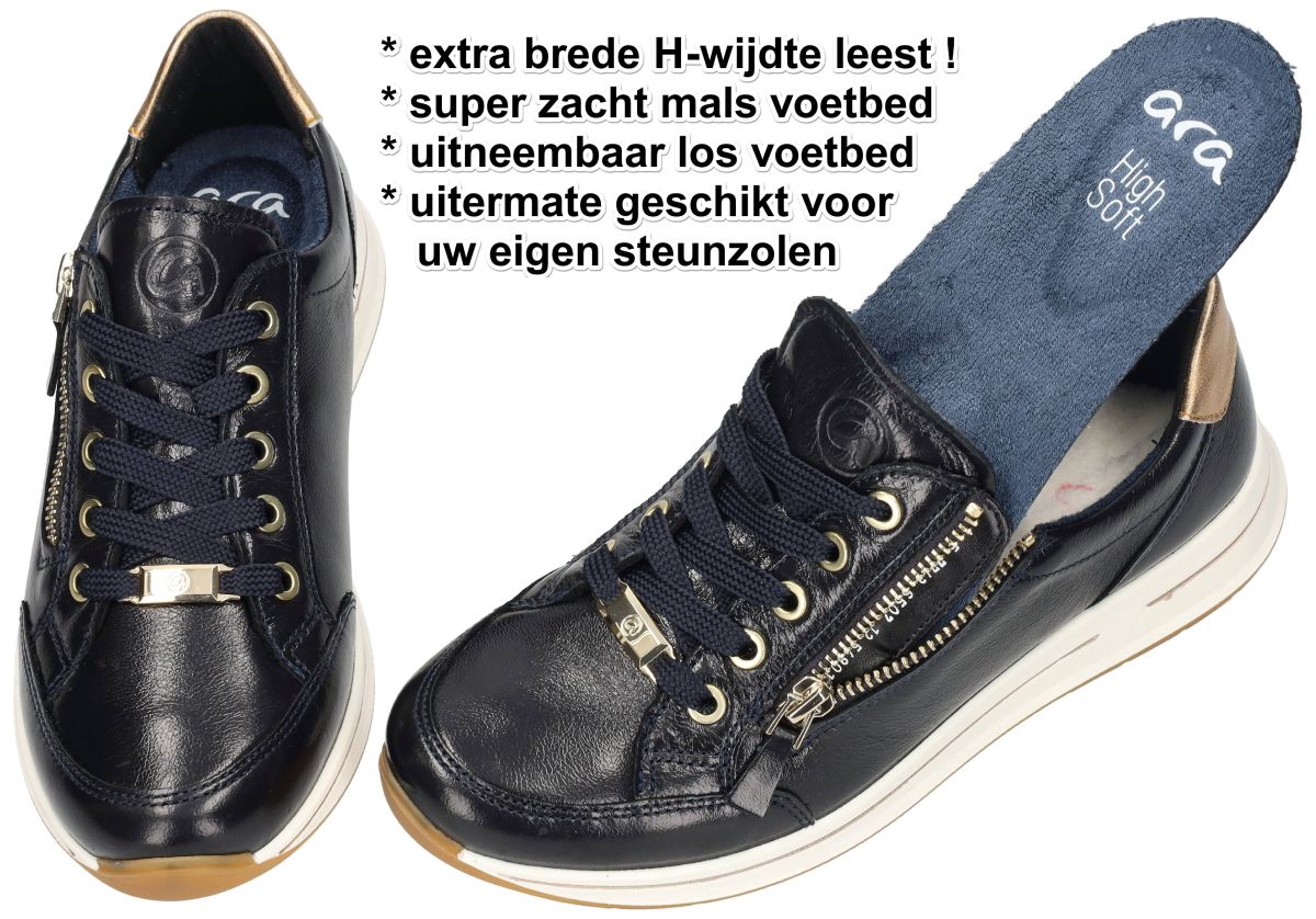 ARA artikel/model 12-54801 - OSAKA 2.0 Fitting H in Crunchlack/metallic Blau, Caramel zijn donker blauwe kreukellack damesschoenen extra brede luxury sneakers of sportieve veterschoenen uit de nieuwe lente/zomer 2026 collectie van het Duitse schoenenmerk en schoenenfabrikant ARA. Deze super comfortabele ara sneakers hebben een extra brede H-wijdte leest en zijn voorzien van een los uitneembaar voetbed dat kan omgewisseld worden met eigen steunzolen. Het superzacht highsoft los voetbed of binnenzool kan worden verwijderd zodat indien noodzakelijk extra volume kan worden vrijgemaakt of voor het plaatsen van eigen steunzolen. Deze sneaker staat op een schokbestendige en veerkrachtige luchtpolster loopzool en zorgt voor een uitermate aangename stap en loopcomfort. De Ara Osaka 2.0 is een damessneaker die comfort en stijl harmonieus combineert. Dit model is ontworpen met hoogwaardige materialen en innovatieve technologieën om een optimale draagervaring te bieden. Het bovenwerk is vervaardigd van glanzend nachtblauw kreukellak leder, wat zorgt voor een luxe uitstraling en duurzaamheid. De technologie van de Ara Osaka 2.0 sneakers combineert een zacht bovenmateriaal met een comfortabele zool, wat resulteert in een dempend effect en vermindering van vermoeidheid bij langdurig dragen. De sneaker is voorzien van een uitneembare binnenzool, waardoor het mogelijk is om persoonlijke inlegzolen te gebruiken voor extra ondersteuning. De binnenvoering bestaat uit badstof op basis van bamboevezels, wat zorgt voor een ademend en vochtabsorberend effect, waardoor een aangenaam voetklimaat behouden blijft. Uitgerust met zowel veters als ritssluiting biedt de Osaka 2.0 een gemakkelijke instap en aanpasbare pasvorm. De flexibele rubberen zool met een hakhoogte van ongeveer 3 cm zorgt voor een goede demping en grip tijdens het lopen. Dit model is beschikbaar in een H-leest, wat betekent dat het geschikt is voor de bredere voet en extra comfort biedt. Deze sneaker is ideaal voor dagelijks gebruik en kan gemakkelijk gecombineerd worden met verschillende outfits, variërend van casual tot sportief. Ara comfortschoenen en sneakers vindt men in onze schoenenwinkel te Denderhoutemregio Aalst, Ninove, Geraardsbergen, Zottegem en Liedekerke of kan men onlinebestellen op onze webshop van maat 35 tot maat 43
