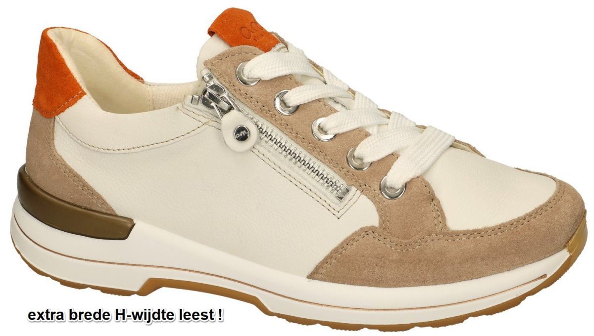 ARA artikel/model 12-24510 - 07H NARA velour, gaucho-soft sand, weiss/ambra zijn damesschoenen extra brede luxury sneakers of sportieve veterschoenen uit de nieuwe lente/zomer 2022 collectie van het Duitse schoenenmerk en schoenenfabrikant ARA. Deze super comfortabele ara sneakers hebben een extra brede H-wijdte leest en zijn voorzien van een los uitneembaar voetbed dat kan omgewisseld worden met eigen steunzolen. Het superzacht highsoft los voetbed of binnenzool kan worden verwijderd zodat indien noodzakelijk extra volume kan worden vrijgemaakt of voor het plaatsen van eigen steunzolen. Deze sneaker staat op een schokbestendige en veerkrachtige luchtpolster loopzool en zorgt voor een uitermate aangename stap en loopcomfort. Het bovenwerk is uitgevoerd in een combinatie van offwhite leder gecombineerd met camel bruin nubuck velours en roest/oranje details. Ara comfortschoenen en sneakers vindt men in onze schoenenwinkel te Denderhoutemregio Aalst, Ninove, Geraardsbergen, Zottegem en Liedekerke of kan men onlinebestellen op onze webshop van maat 35 tot maat 43