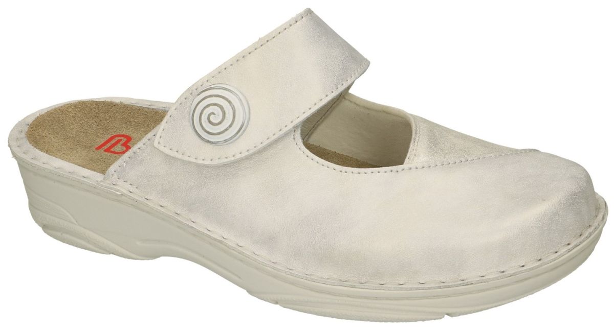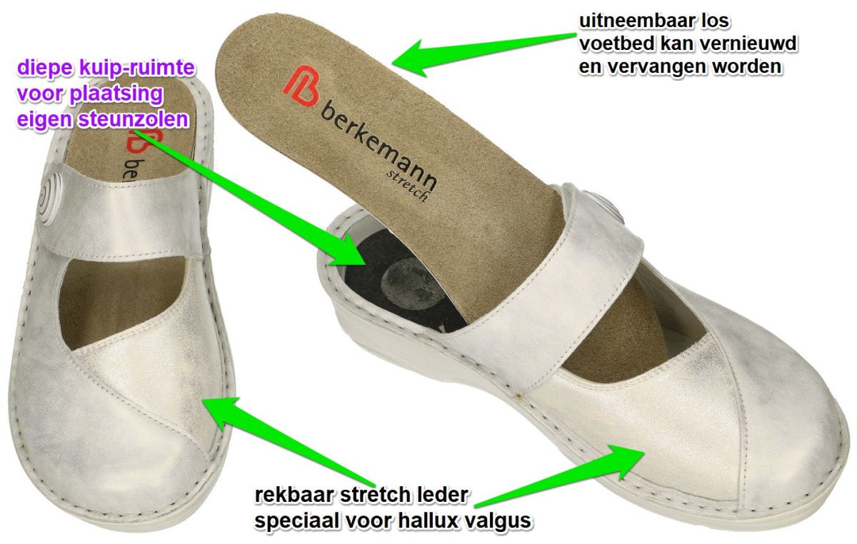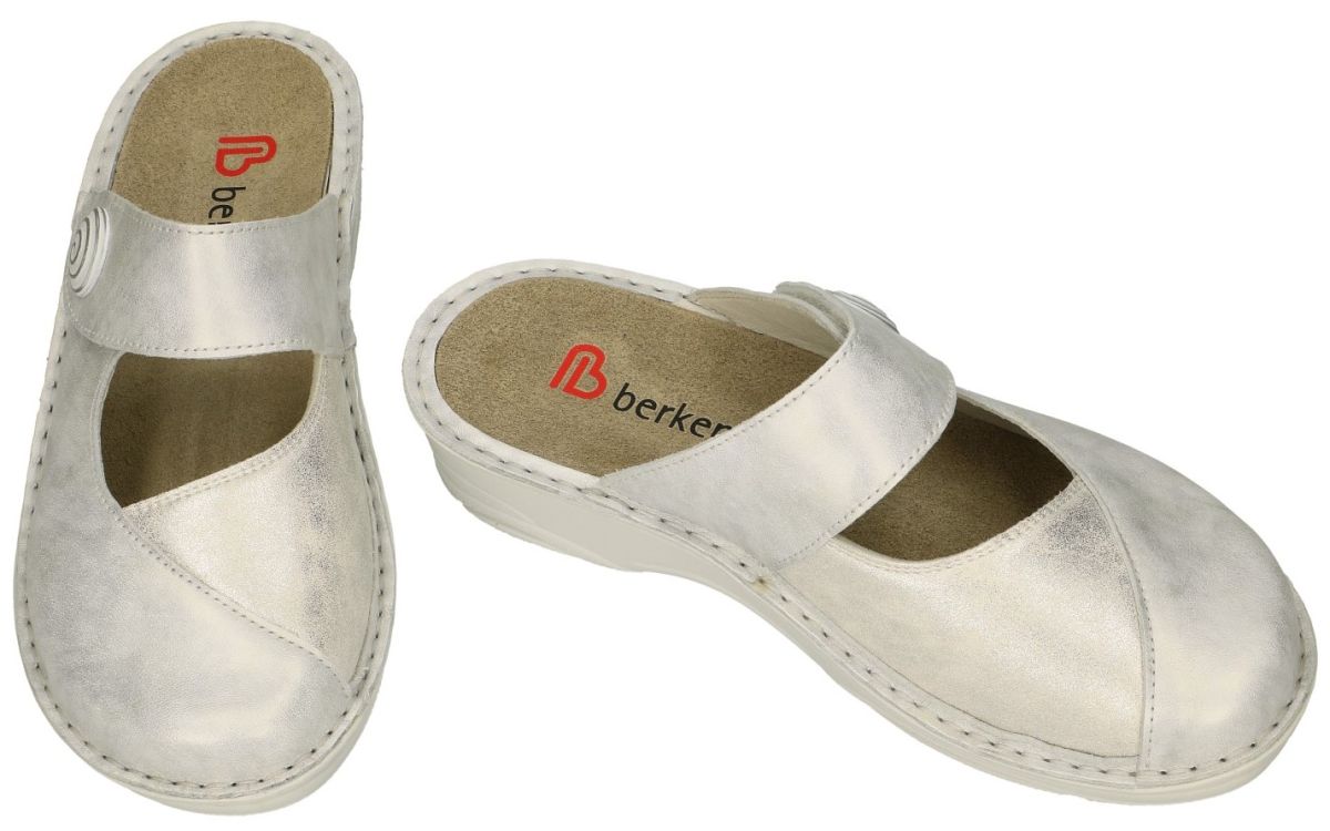 Berkemann berkoflex model 03457-158 HELIANE silber/glitter leder/stretch zijn extra brede damesschoen slippers, pantoffels, sloffen of muilen uitgevoerd in zilver metallic leder gecombineerd met glitterzilver stretch leder van het Duitse schoenenmerk Berkemann. Deze comfort of orthopedische dames slipper pantoffel muil van Berkemann heeft een elastisch rekbaar inzetstuk ter hoogte van het gewricht van de grote teen speciaal voor hallux valgus problemen. Bovendienheeft deze comfortabele Berkemann slipper muil een uitneembaar voetbed en een diepe kuipzool zodat indien nodig ook eigen steunzolen kunnen worden geplaatst. Door de strech eigenschappen is de breedte van deze pantoffel variabel van G-wijdte tot I-wijdte. In Berkemann schoenen met stretch inzetstukken voelen uw vermoeide voeten zich eindelijke weer goed. Berkemann orthopedische slippers en sandalen vindt men in onze schoenenwinkel regio Aalst, Ninove, Geraardsbergen, Zottegemof kan men online bestellen op onze webshop.
