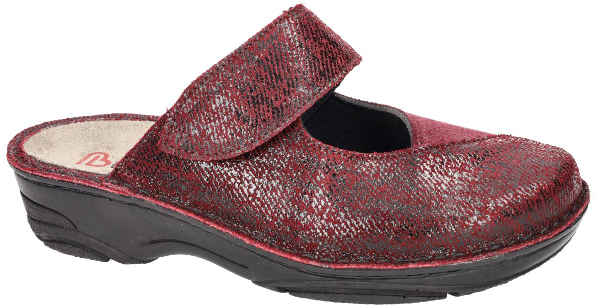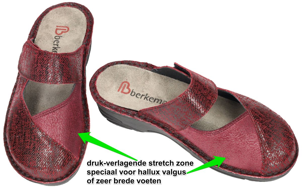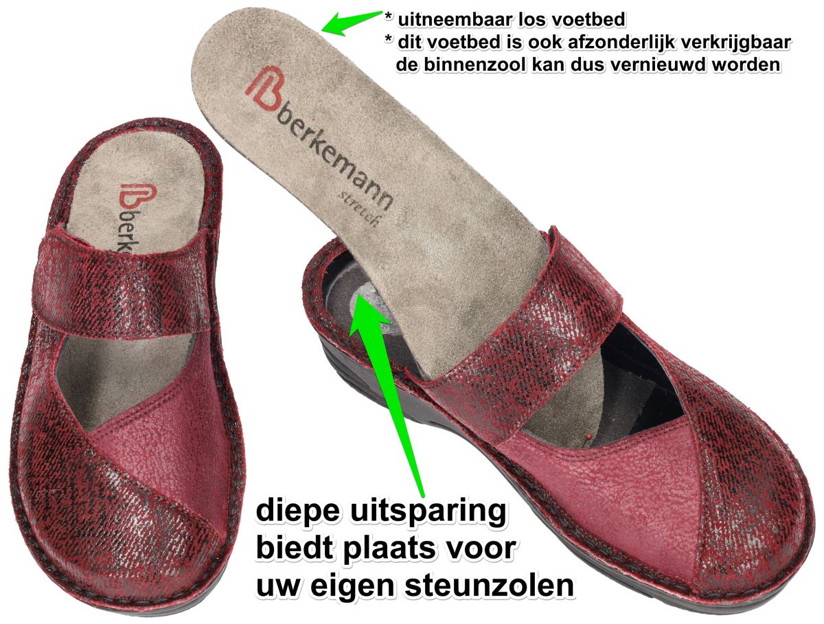 De bekende Berkemann Heliane 03457 damesschoenen zijn een perfecte keuze voor iedereen die het allerhoogste comfort met stijl wil combineren. De versie/kleur 218 bordeaux Leder is uitgevoerd in een glanzend bordeaux/zwart leder met een textiel-print gecombineerd met een bordeaux stretchzone. Dit model biedt niet alleen een modieuze uitstraling, maar ook uitzonderlijke functionaliteit, vooral voor vrouwen met voetproblemen zoals hallux valgus of brede, volumineuze voeten. De Heliane muil-slippers zijn gemaakt van hoogwaardig leer en hebben een gedeeltelijke stretch inzet aan de binnenkant van de schoen. Dit ontwerp helpt druk- en schuurpunten te verlichten, waardoor ongemakken en zelfs pijn vanaf het eerste moment worden verminderd. Deze flexibele stretchmaterialen zien eruit als echt leer, wat bijdraagt aan de esthetische aantrekkingskracht van de schoenen. Een van de belangrijkste kenmerken van deze schoenen is het uitneembare voetbed, wat vervangbaar is en apart kan worden aangeschaft. Dit maakt de Heliane zeer geschikt voor het gebruik van eigen steunzolen. Het voetbed is bedekt met zacht leer en biedt uitstekende ondersteuning en comfort gedurende de dag. Daarnaast is de zool van deze muil-slippers gemaakt van duurzaam polyurethaan, wat zorgt voor een goede grip en stabiliteit. De hakhoogte van 3,5 cm biedt net genoeg lift zonder in te leveren op comfort, wat deze schoenen ideaal maakt voor dagelijks gebruik. In het kort, de Berkemann Heliane 03457 is een veelzijdige en comfortabele keuze, ontworpen met aandacht voor detail en de behoeften van vrouwen met voetproblemen. Deze schoenen combineren elegantie met praktische voordelen, waardoor ze een waardevolle toevoeging zijn aan je schoenencollectie. Berkemann orthopedische slippers en sandalen vindt men in onze schoenenwinkel regio Aalst, Ninove, Geraardsbergen, Zottegemof kan men online bestellen op onze webshop.