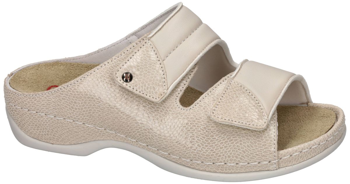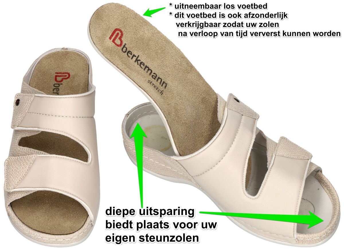 BERKEMANN artikel/model 01021-737 FINJA altbeige leder zijn damesschoenen hallux valgus comfort slippers in beige leder met een reptiel-print gecombineerd met beige stretchmateriaal van het Duitse schoenenmerk BERKEMANN. Deze comfort of orthopedische dames slipper pantoffel muil van Berkemann is aan de binnenzijde (kant van de dikke teen) uitgevoerd in rekbaar stretch kunstleder speciaal voor hallux valgus heeft een dik uitneembaar voetbed in een voorgevormde kuip zodat deze slipper uitermate geschikt is om dikke steunzolen te plaatsen. De velcrosluitingen ter hoogte van de wreef en voorvoet zorgen voor een comfortabele steun. Deze praktische Berkemann slipper heeft een hakhoogte van 3,5 cm en de breedte is aanpasbaar van E-wijdte (smalle voet) tot H-wijdte (brede voet). In het Finja-model zorgen twee brede, gewatteerde riemen met praktische klittenbandsluitingen voor een veilige ondersteuning. Bovendien passen de bandjes zich aan de natuurlijke voetvorm aan en zorgen zo voor een comfortabele pasvorm. Dit model heeft ook andere comfortfuncties die het lopen en staan aangenaam vergemakkelijken. De gedeeltelijke stretch inserts aan de binnenkant van de schoenen verlichten de druk op grote gebieden en bieden verlichting voor vermoeide voeten vanaf de eerste slijtage. Klachten over druk- en schuurpunten, zoals veroorzaakt door bijvoorbeeld hallux valgus, vinden een snelle pijnverlichting, ook dankzij de extra, zachte vulling van het flexibele materiaal. Zoals alle BerkemannFlex-modellen van Berkemann heeft Finja ook uitneembare voetbedden met echt leer, die in de wasmachine op 30°C kunnen worden gewassen of, indien nodig, ook gemakkelijk kunnen worden vervangen door orthopedische op maat gemaakte inlegzolen.