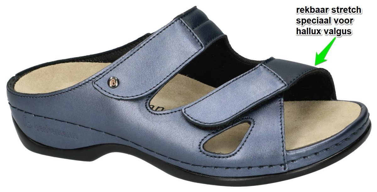 Het artikel/model 01027-371 JANNA blau * perlato stretch is een damesschoenen hallux valgus comfort slipper in donker metaal blauw metallic leder en donkerblauw stretchmateriaal van het Duitse schoenenmerk BERKEMANN. Deze comfort of orthopedische dames slipper pantoffel muil van Berkemann is aan de binnenzijde (kant van de dikke teen) uitgevoerd in rekbaar stretch kunstleder speciaal voor hallux valgus heeft een dik uitneembaar voetbed in een voorgevormde kuip zodat deze slipper uitermate geschikt is om dikke steunzolen te plaatsen. De velcrosluitingen ter hoogte van de wreef en voorvoet zorgen voor een comfortabele steun. Deze praktische Berkemann slipper heeft een hakhoogte van 3,5 cm en de breedte is aanpasbaar van E-wijdte (smalle voet) tot H-wijdte (brede voet). Berkemann orthopedische slippers en sandalen vindt men in onze schoenenwinkel regio Aalst, Ninove, Geraardsbergen, Zottegemof kan men online bestellen op onze webshop.