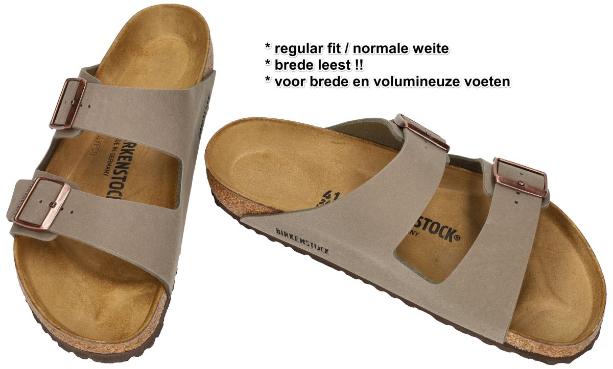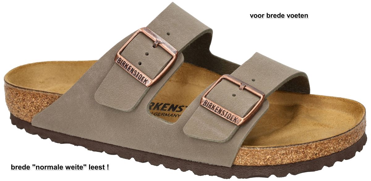 Birkenstock 0151211 Arizona Normale weite / Regular fit in Birko-Flor Birkibuc: Ontdek de ideale balans tussen robuustheid en comfort met de Birkenstock Arizona slippers voor heren, uitgevoerd in taupe Birko-Flor Birkibuc. Deze klassieke slippers met een brede 'normale weite' leest zijn speciaal ontworpen voor mannen met brede en volumineuze voeten en beloven een ruime en comfortabele pasvorm. Het Birkenstock voetbed is de kern van alle comfort dat deze slippers bieden. De diepe hielkom ondersteunt en stabiliseert de hiel, terwijl de opstaande rand aan de voorkant van de slipper ruimte biedt aan de tenen. Het voetbed volgt de natuurlijke vorm van de voet en biedt uitmuntende ondersteuning aan de voetboog, een kenmerkend element dat Birkenstock zo populair maakt. Deze weloverwogen ontwerpelementen dragen bij aan een natuurlijke en gezonde loopbeweging. Het bovenmateriaal, Birko-Flor Birkibuc, is een imitatie nubuck of suède en staat bekend om zijn duurzaamheid en huidvriendelijke eigenschappen. Deze slippers in taupe zijn niet alleen stijlvol, maar ook praktisch voor dagelijks gebruik. De twee verstelbare gespen zorgen ervoor dat de slippers perfect aan uw voeten aanpassen. Een lichtgewicht EVA-zool rondt het ontwerp af en biedt zowel schokabsorptie als duurzaamheid. Dit materiaal is slijtvast, waardoor de slippers ideaal zijn voor veelvuldig gebruik, of u nu thuis ontspant of de stad verkent. Met deze Birkenstock Arizona slippers in stone of donkertaupe Birko-Flor Birkibuc kiest u voor een ongeëvenaarde mix van tijdloze stijl en het onbetwiste comfort waar Birkenstock bekend om staat. Perfect voor de moderne man die waarde hecht aan kwaliteit en comfort voor zijn voeten. Birkenstock Arizona slippers voor heren vindt men in onze schoenenwinkel regio Aalst, Ninove, Geraardsbergen, Liedekerkeof kan men online bestellen op onze webshop. Hebben we u maat niet op voorraad dan kunnen we die voor u bestellen van maat 39 tot 46 in de kleur die u wenst.