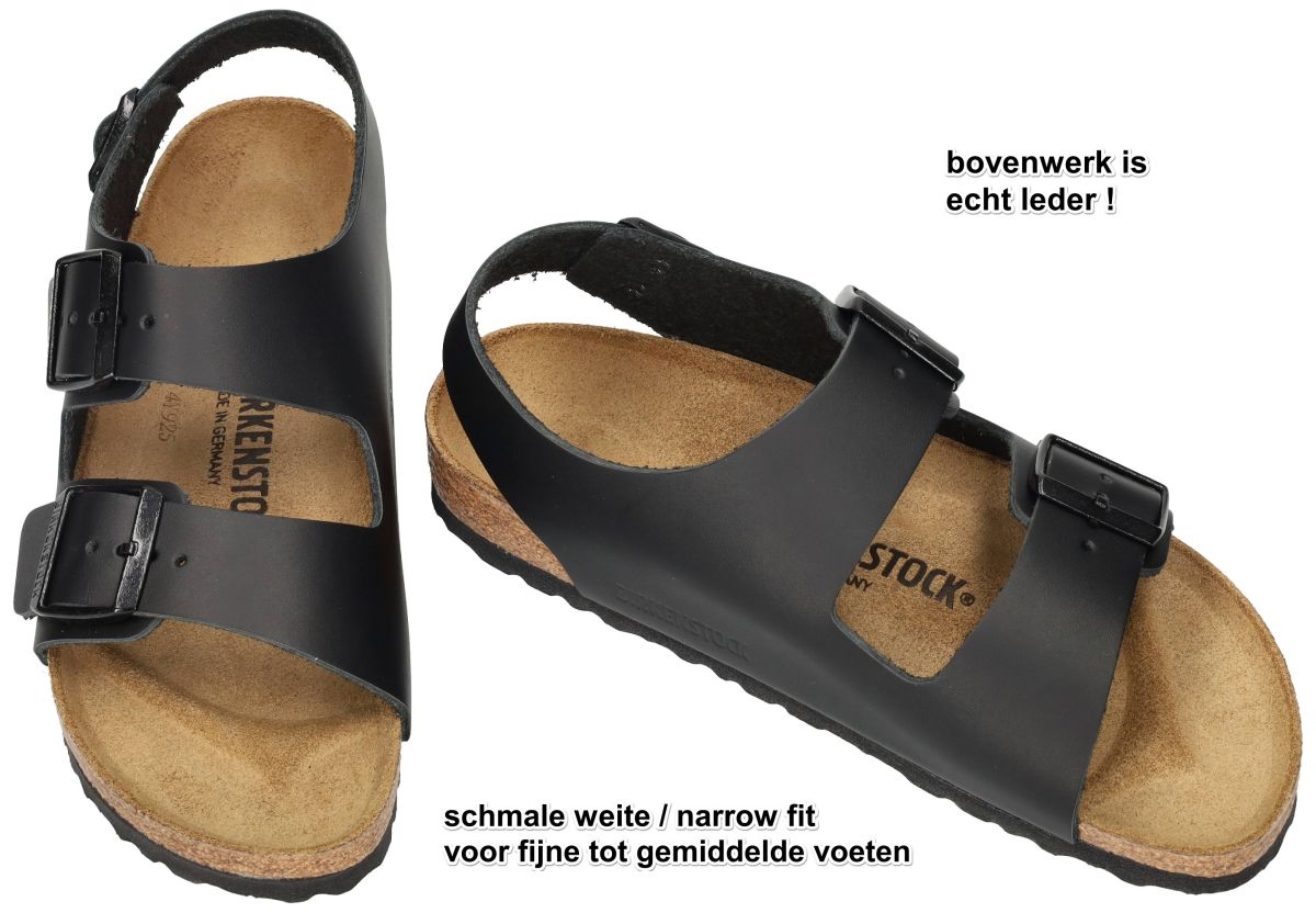 Birkenstock Milano BS 0034193 – stevige sandaal in black Natural Leather met smalle leest. Deze Birkenstock Milano BS is een tijdloze klassieker voor wie houdt van maximale stabiliteit en het authentieke Birkenstock-comfort. Dit model (art. 0034193) is uitgevoerd in zwart Natural Leather, een hoogwaardig, robuust en natuurlijk gelooid leder dat zich na verloop van tijd prachtig naar de voet vormt. De drie verstelbare riemen – twee over de wreef en één rond de hiel – zorgen voor een perfecte fixatie, waardoor de sandaal uitermate geschikt is voor dagelijks gebruik of langere wandelingen. De gespen in matzwart met Birkenstock-gravure, zoals duidelijk zichtbaar op je productfoto’s, versterken de minimalistische en moderne uitstraling. De kurk-latex zool, een echte Birkenstock-signatuur, biedt uitstekende schokdemping en ondersteuning, terwijl het suède voetbed een natuurlijk, zacht gevoel geeft. Deze uitvoering is vervaardigd in de smalle leest (Narrow Fit) – ideaal voor mensen met een fijne tot gemiddelde voet of wie graag een compacter omsluitende pasvorm wenst. De zwarte EVA-loopzool maakt de sandaal licht, flexibel en slipbestendig. Het kenmerkende Birkenstock voetbed is met precisie ontworpen om de druk gelijkmatig over de voetzool te verdelen en biedt een anatomisch correcte ondersteuning die essentieel is voor een gezonde voet. Dit wordt bereikt door een diepe hielkom, een opstaande rand bij de tenen en een contour in het midden van de voet die samenwerken om de natuurlijke functie van de voet te ondersteunen en te bevorderen. Het resultaat is optimaal comfort, dag na dag. Gecombineerd met de natuurlijke kurkzool en de dempende EVA-loopzool, biedt het natuurlijke lederen bovenwerk een stijlvolle en robuuste finish die mettertijd aan karakter wint. De verstelbare gespen van metaal zorgen voor een persoonlijke pasvorm en de subtiele Birkenstock branding rondt het ontwerp stijlvol af. Deze zwarte Birkenstock Milano is de perfecte keuze voor wie zoekt naar een duurzame, comfortabele én stijlvol sobere sandaal die jarenlang meegaat. Ideaal voor dagelijks dragen, vakanties en lange wandelingen. Birkenstock slippers en sandalen vindt men in onze schoenenwinkel regio Aalst, Ninove, Geraardsbergen, Liedekerkeof kan men online bestellen op onze webshop. Hebben we u maat niet op voorraad dan kunnen we die voor u bestellen van maat 35 tot 43 in de kleur die u wenst.