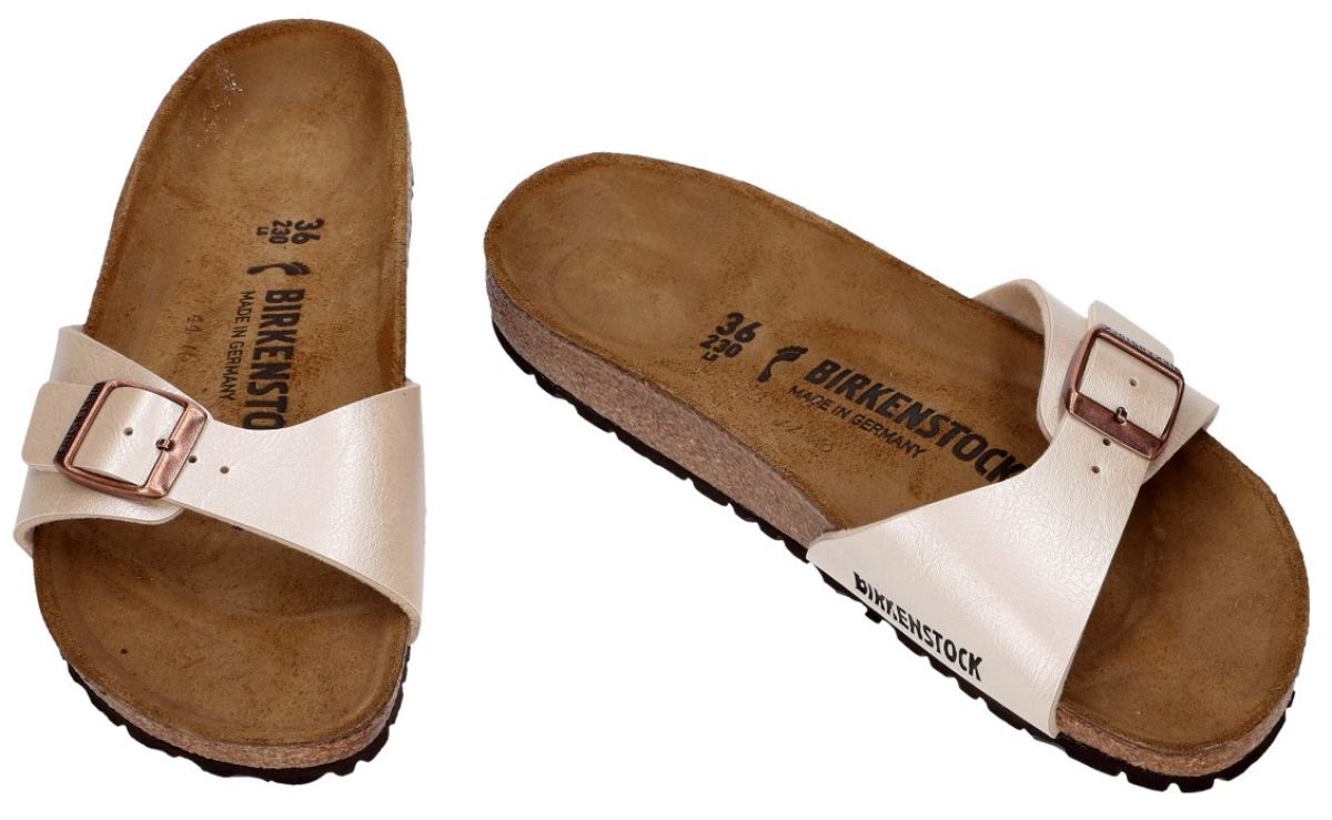 BIRKFLOR BOVENWERK ! Het model MADRID graceful pearl white is een beige parelglans damesschoenen slipper of muiltje van het Duitse schoenenmerk Birkenstock.Deze Birkenstock Madrid damesslipper met smal tot normale leest kenmerkt zich door het typische orhopedische birkenstock voetbed dat steunzolen overbodig maakt. Dit voetbed is vervaardigd uit veerkrachtig natuurkurk overtrokken met echt leder.De anti-slip loopzool is gemaakt van duurzaam slijtvast lichtgewicht foam polyethyleen. Het bovenwerk bestaat uit kunstleder birkoflor en kan door middel van een grote monkgesp volledig worden opengemaakt en aangepast aan elk type voet.Birkenstock slippers en sandalen vindt men in onze schoenenwinkel regio Aalst, Ninove, Geraardsbergen, Liedekerkeof kan men online bestellen op onze webshop. Hebben we u maat niet op voorraad dan kunnen we die voor u bestellen van maat 35 tot 43 in de kleur die u wenst.