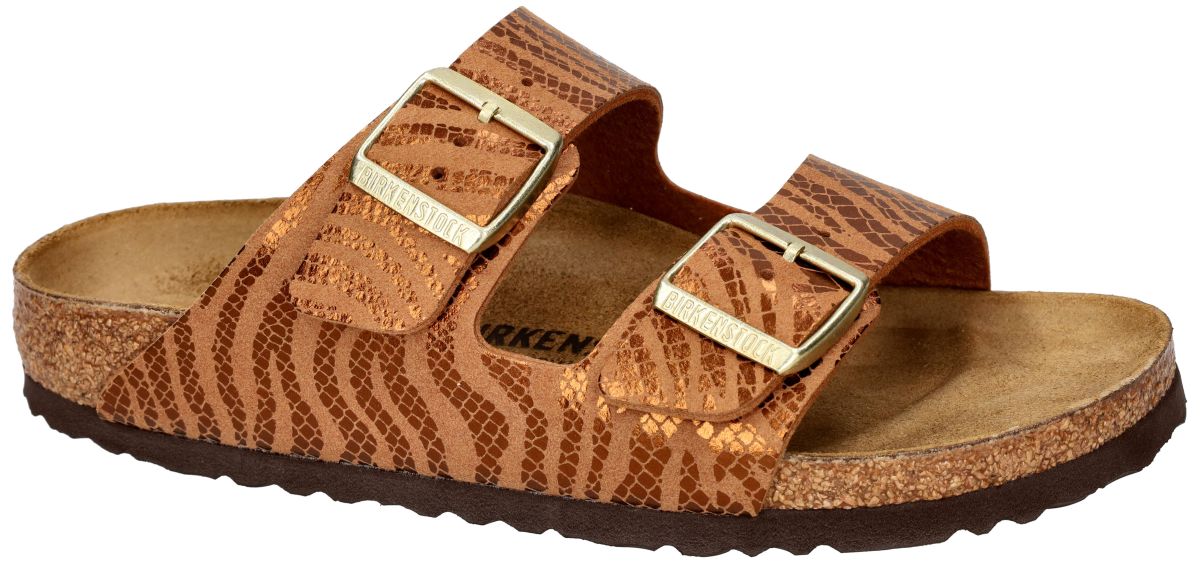Ga voor klassiek comfort en minimalistische elegantie met deze Birkenstock Arizona Synthetik Zebra Pecan (artikel 1029509) slippers in een zebraprint met camelbruine en koper metallic strepen. Deze iconische slippers zijn het toppunt van ontspannen luxe en anatomisch ergonomische ondersteuning, en vormen een stijlvolle aanvulling op elke outfit. Het hart van de Birkenstock slipper is het typische natuurkurk voetbed, dat met uiterste precisie is ontworpen om de druk gelijkmatig correct onder de voetzool te verdelen. Met een diepe hielkom, een opstaande rand bij de tenen, een tenengrijper-heuveltje en een contour onder de boog van de voet, ondersteunt en bevordert dit voetbed de natuurlijke functie van de voet. Het voetbed biedt anatomisch correcte ondersteuning die essentieel is voor een gezonde voethouding. Dit resulteert in optimaal comfort dat de tand des tijds doorstaat. De slippers zijn uitgevoerd in een unieke creatieve zebra print met glanzend koper metallic strepen op een camel bruine achtergrond geprint op onderhoudsvriendelijke synthetisch bovenmateriaal. Deze huidvriendelijke stof biedt een gladde lederlook aan de buitenzijde en een zacht vlies aan de binnenzijde, waardoor uw voeten genieten van elk moment dat ze in deze slippers doorbrengen. Met de 'schmale weite' leest zijn deze slippers speciaal ontworpen voor degenen met fijne tot normale voeten. Dit biedt een gestroomlijnde esthetiek terwijl het comfort behouden blijft dat synoniem staat voor Birkenstock. De loopzool, vervaardigd uit hoogwaardig EVA, combineert lichtheid met flexibiliteit en is schokabsorberend, waardoor de slippers uitermate geschikt zijn voor langdurig gebruik. Deze zool draagt bij aan het comfort en zorgt voor stabiele grip, waarbij elke stap moeiteloos aanvoelt. De Birkenstock Arizona slippers in Zebra Pecan uitvoering zijn een ware ode aan comfort en stijl. Of u nu de stad verkent of ontspant na een lange dag, deze slippers zijn de definitie van relaxte elegantie. Trakteer uw voeten op het beste met Birkenstock, en ervaar zelf waarom dit merk synoniem staat voor ultiem loopcomfort. Birkenstock slippers en sandalen vindt men in onze schoenenwinkel regio Aalst, Ninove, Geraardsbergen, Liedekerkeof kan men online bestellen op onze webshop. Hebben we u maat niet op voorraad dan kunnen we die voor u bestellen van maat 35 tot 43 in de kleur die u wenst.