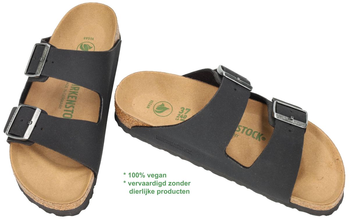 Birkenstock Arizona Vegan Black – Smalle wijdte (artikelnummer 1019057). Deze iconische Birkenstock Arizona slipper is al decennialang een klassieker. In deze vegan uitvoering is het tijdloze ontwerp volledig vervaardigd zonder dierlijke materialen, met behoud van het vertrouwde Birkenstock comfort en kwaliteit. De twee verstelbare banden in zwart synthetisch materiaal (Birko-Flor® Vegan) sluiten mooi aan rond de voet en zorgen voor een persoonlijke pasvorm. De smalle wijdte (Schmale Weite) maakt dit model ideaal voor mensen met smalle tot gemiddelde voeten. Het anatomisch gevormde kurk-latex voetbed biedt natuurlijke ondersteuning, stabiliteit en optimaal draagcomfort, terwijl de EVA-loopzool schokken opvangt en grip garandeert op verschillende ondergronden. Belangrijkste kenmerken: Model: Birkenstock Arizona Vegan Black. Artikelnummer: 1019057. 100% vegan – vervaardigd zonder dierlijke producten. Bovenmateriaal: synthetisch Birko-Flor® Vegan. Binnenzool: microvezel, vrij van leer . Voetbed: anatomisch gevormd kurk-latex voetbed . Zool: EVA met antislipprofiel . Pasvorm: smalle wijdte (Schmale Weite). Kleur: zwart . Verstelbare metalen gespen met gegraveerd Birkenstock-logo Made in Germany – garantie voor duurzame kwaliteit. Waarom kiezen voor de Arizona Vegan? Deze duurzame versie van de populaire Arizona is het perfecte alternatief voor wie bewust kiest voor diervriendelijke materialen zonder in te boeten aan stijl of comfort. De neutrale zwarte kleur past bij elke outfit – van casual tot minimalistisch – en maakt deze slippers onmisbaar voor warme zomerdagen, thuis of op vakantie. Ervaar de authentieke Birkenstock ondersteuning in een modern, vegan jasje. Birkenstock slippers en sandalen vindt men in onze schoenenwinkel regio Aalst, Ninove, Geraardsbergen, Liedekerkeof kan men online bestellen op onze webshop. Hebben we u maat niet op voorraad dan kunnen we die voor u bestellen van maat 35 tot 43 in de kleur die u wenst.