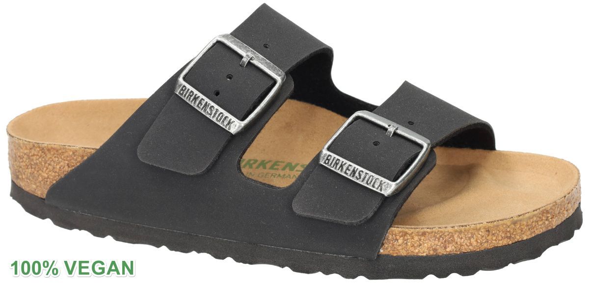 Birkenstock Arizona Vegan Black – Smalle wijdte (artikelnummer 1019057). Deze iconische Birkenstock Arizona slipper is al decennialang een klassieker. In deze vegan uitvoering is het tijdloze ontwerp volledig vervaardigd zonder dierlijke materialen, met behoud van het vertrouwde Birkenstock comfort en kwaliteit. De twee verstelbare banden in zwart synthetisch materiaal (Birko-Flor® Vegan) sluiten mooi aan rond de voet en zorgen voor een persoonlijke pasvorm. De smalle wijdte (Schmale Weite) maakt dit model ideaal voor mensen met smalle tot gemiddelde voeten. Het anatomisch gevormde kurk-latex voetbed biedt natuurlijke ondersteuning, stabiliteit en optimaal draagcomfort, terwijl de EVA-loopzool schokken opvangt en grip garandeert op verschillende ondergronden. Belangrijkste kenmerken: Model: Birkenstock Arizona Vegan Black. Artikelnummer: 1019057. 100% vegan – vervaardigd zonder dierlijke producten. Bovenmateriaal: synthetisch Birko-Flor® Vegan. Binnenzool: microvezel, vrij van leer . Voetbed: anatomisch gevormd kurk-latex voetbed . Zool: EVA met antislipprofiel . Pasvorm: smalle wijdte (Schmale Weite). Kleur: zwart . Verstelbare metalen gespen met gegraveerd Birkenstock-logo Made in Germany – garantie voor duurzame kwaliteit. Waarom kiezen voor de Arizona Vegan? Deze duurzame versie van de populaire Arizona is het perfecte alternatief voor wie bewust kiest voor diervriendelijke materialen zonder in te boeten aan stijl of comfort. De neutrale zwarte kleur past bij elke outfit – van casual tot minimalistisch – en maakt deze slippers onmisbaar voor warme zomerdagen, thuis of op vakantie. Ervaar de authentieke Birkenstock ondersteuning in een modern, vegan jasje. Birkenstock slippers en sandalen vindt men in onze schoenenwinkel regio Aalst, Ninove, Geraardsbergen, Liedekerkeof kan men online bestellen op onze webshop. Hebben we u maat niet op voorraad dan kunnen we die voor u bestellen van maat 35 tot 43 in de kleur die u wenst.