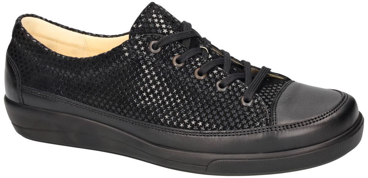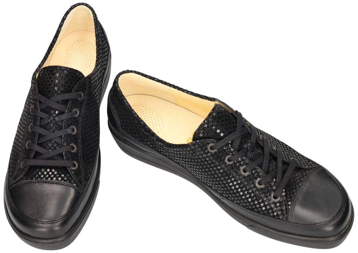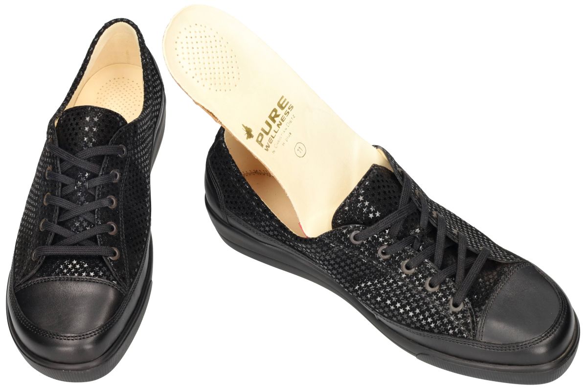 Christian Dietz Pure Wellness 6954195114 – unieke dames sneaker in buitengewone maat 46, nu met 40% korting! Zoek je een stijlvolle, comfortabele en uitzonderlijk grote damesmaat? Deze sneaker van Christian Dietz uit de Pure Wellness-lijn is een ware vondst: maat 46, een maat die in damescollecties bijna nooit voorkomt. Bovendien wordt dit paar nu aangeboden met 40% korting – dé kans voor wie op grote voet leeft! Het ontwerp combineert klasse met speelse details: – Zwart gladleder voor een tijdloze en verzorgde look – Zwart suède met subtiele glanzende sterretjesprint geeft de schoen een verfijnde, modieuze twist. Binnenin ervaar je hoe comfort en kwaliteit elkaar versterken: – Lederen binnenvoering voor een zacht en ademend voetklimaat – Uitneembaar voetbed, met leer bekleed, ideaal voor extra demping of het plaatsen van eigen steunzolen. Onder de voet zorgt de schokabsorberende zool voor moeiteloos wandelcomfort, perfect voor dagelijks gebruik. Exceptionele maat 46 – uiterst zeldzaam in damesschoenen. Premium materialen en Pure Wellness comfort. Nu aan 40% korting. Een sneaker die elegantie, comfort en bijzondere maatvoering verenigt – ideaal voor de vrouw die letterlijk op grote voet leeft. Wacht niet te lang, want een paar als dit vind je niet snel opnieuw!