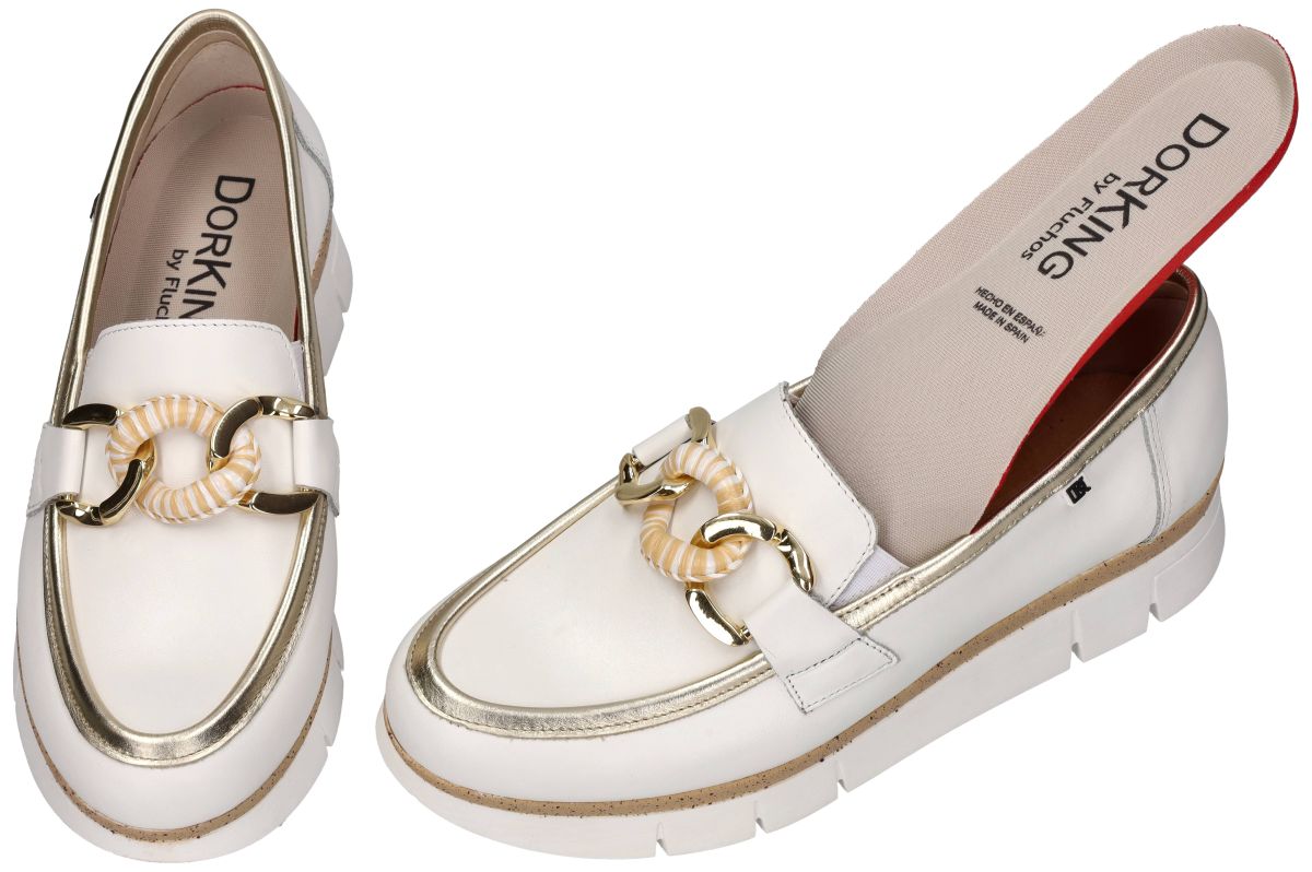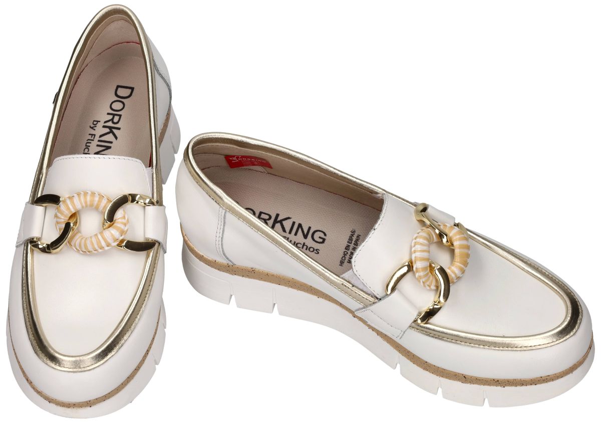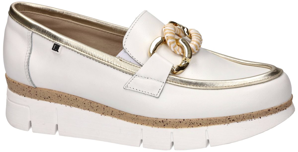 Verfijn je dagelijkse look met deze hippe Dorking INDIA D9691-SULA loafer mocassins in de uitvoering sugar bianco + platino gold. Deze stijlvolle schoenen combineren het klassieke comfort van Dorking met een eigentijdse flair, waardoor ze perfect zijn voor zowel casual als formele gelegenheden. Materiaal: Deze loafers zijn vervaardigd uit hoogwaardig suikerwit leder met een goud metallic omboording, wat ze een luxe uitstraling geeft. Ontworpen met een moderne spiegelinzet op het bovenblad en voorzien een opvallende sieraad kettingdetail op de wreef, voegen deze schoenen een trendy touch toe aan je outfit. Comfort: Zoals gebruikelijk bij Dorking-loafers, zijn deze loafers ontworpen met het oog op comfort, waardoor ze ideaal zijn voor langdurig dragen door onder andere de dikke gelaagde plateauzool. Veelzijdigheid: De sjieke parelmoer wit + goud kleurstelling maakt het eenvoudig om deze loafers te combineren met diverse outfits, van zakelijke kledij tot meer ontspannen looks maar wellicht ook zeer bij zomerse barbeque feestjes. Dorking staat bekend om zijn inzet voor zowel stijl als comfort, en deze loafers zijn geen uitzondering. Ze bieden een perfecte mix van functionaliteit en modieuze uitstraling, ideaal voor de moderne vrouw. Dorking mocassins en loafers kan men rechtstreeks kopen in onze schoenenwinkel regio Aalst, Ninove, Geraardsbergen, Zottegem, Liedekerke of online bestellen in onze webshop.