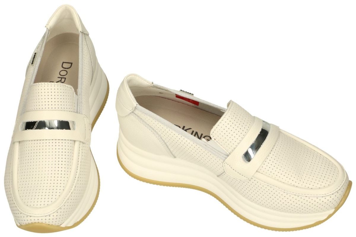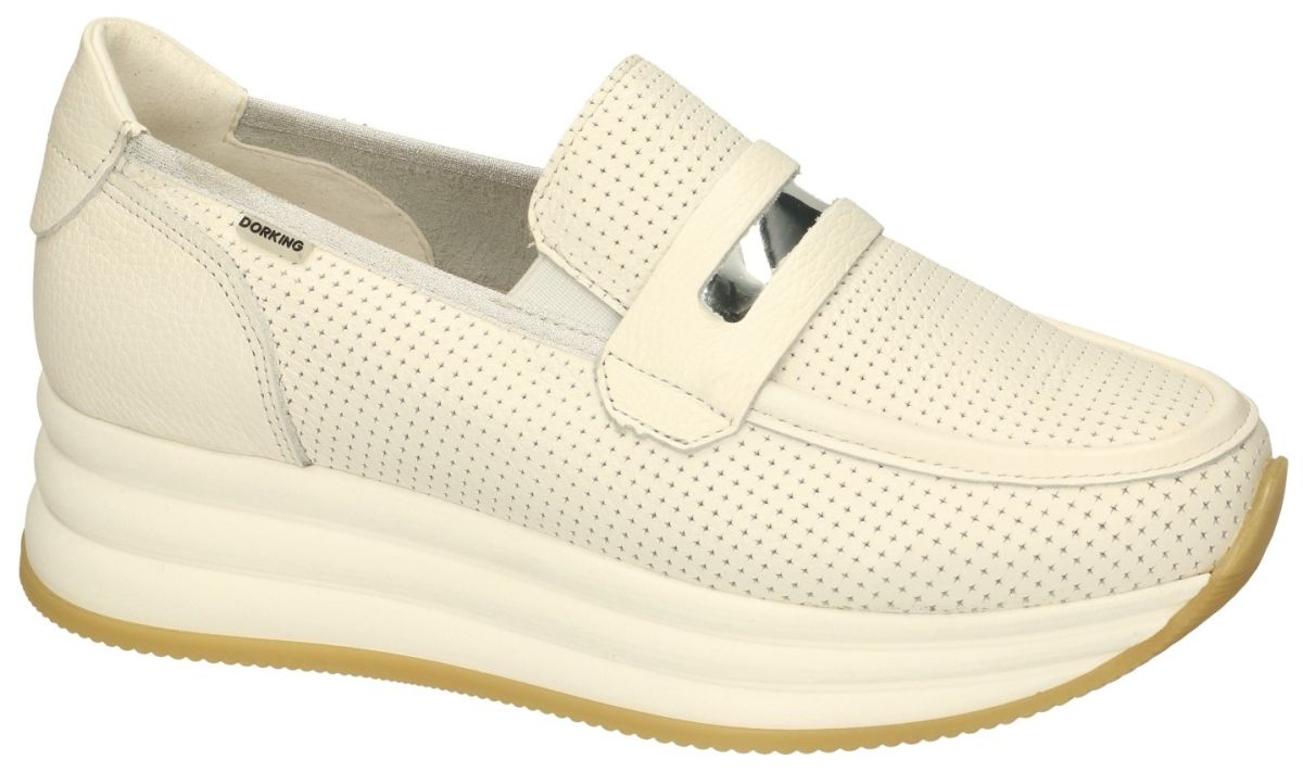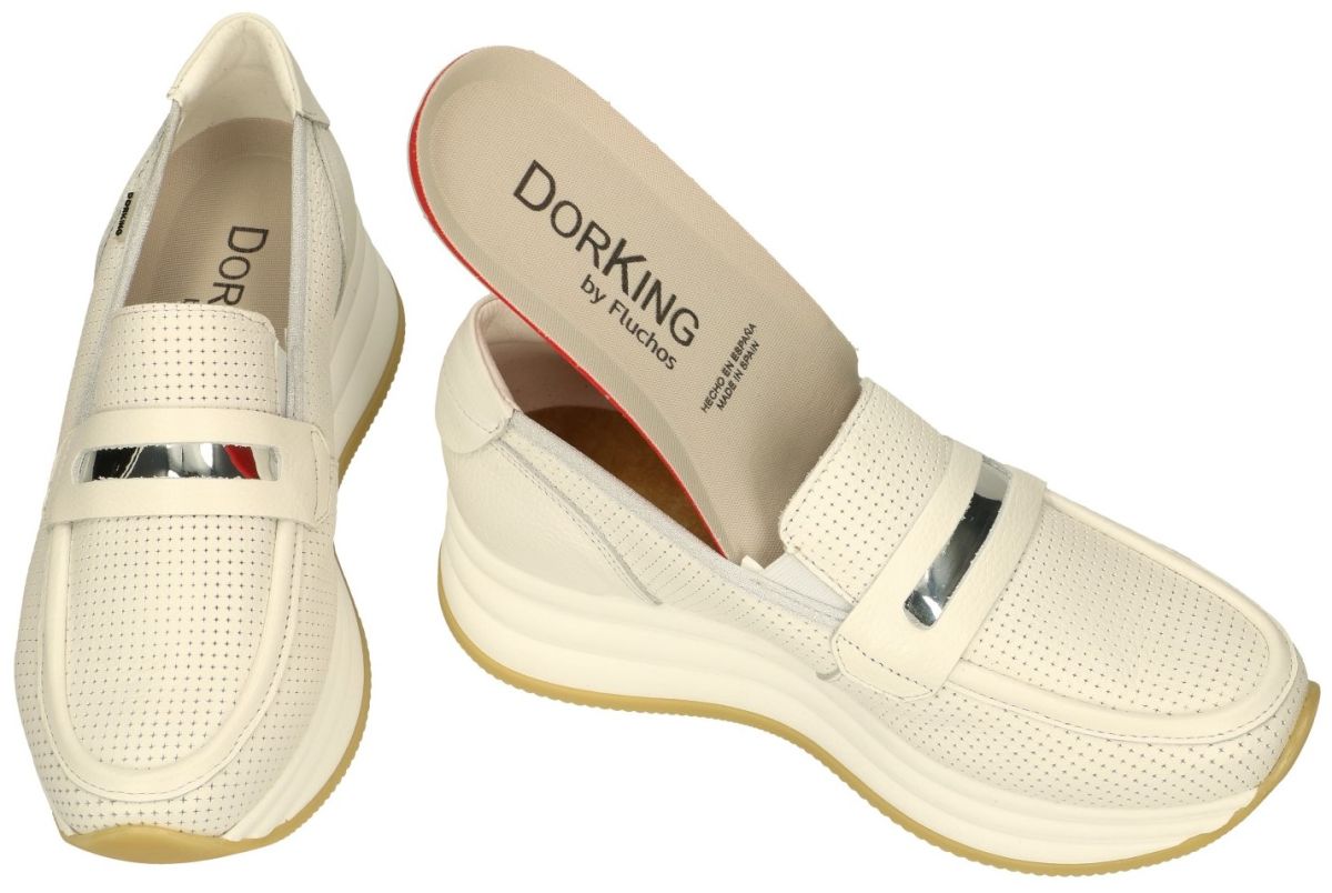 DORKING by Fluchos artikel/model DRAZ D9243 indios blanco zijn witte (ecru-wit) damesschoenen meerbepaald plateauzool loafers instapschoenen uit de nieuwe lente/zomer 2024 collectie van het Spaanse schoenenmerk Dorking. Deze Dorking DRAZ mocassins zijn uitgevoerd in een wit met fijne sterretjes geperforeerd leder met spiegelinzet en een pennyloaferband over de wreef. Deze hippe Dorking plateau-loafers staan op een ultra lichtgewicht dikke opvallende plateauzool van 3 cm dik vooraan naar 5 cm aan de hiel. De werkelijke hielhoogte is dus 2 cm. Deze leuke Dorking mocassins hebben een uitneembaar los voetbed en zijn dus geschikt voor eigen steunzolen. Dorking damesschoenen en pumps kan men rechtstreeks kopen in onze schoenenwinkel regio Aalst, Ninove, Geraardsbergen, Zottegem, Liedekerke of online bestellen in onze webshop.
