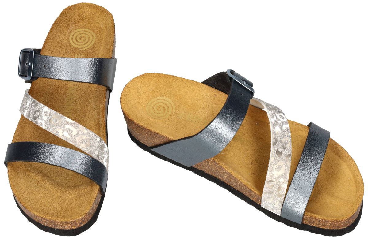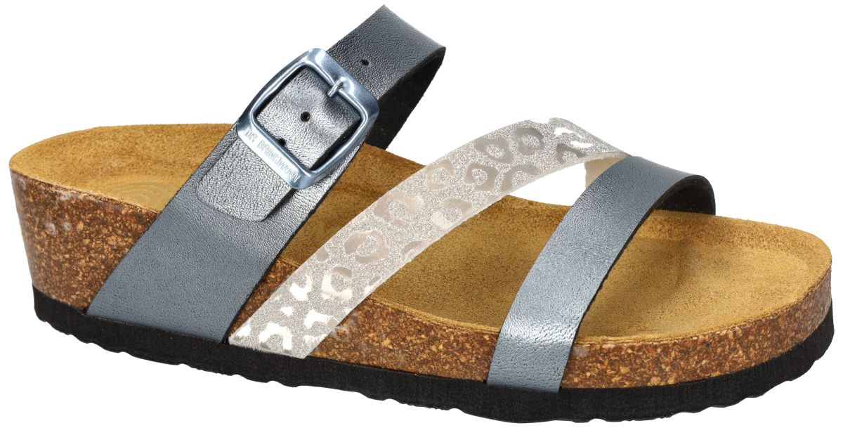Ontdek de perfecte mix van comfort en moderne flair met deze Dr. Brinkmann DIANA-2/223 sleehak slippers in de uitvoering Peltro. Deze eigentijdse damesslippers combineren podologisch comfort met een opvallende metallic look in staalblauw en zilver. De geïntegreerde wedge of sleehak lift de hiel 2½ cm op en zorgt voor een natuurlijke, licht ondersteunende houding. Ideaal voor wie graag wat extra hoogte wil zonder in te boeten op stabiliteit en draagcomfort. Het zachte, veerkrachtige voetbed is bekleed met hoogwaardig nubuck leer en anatomisch gevormd volgens podologische principes. Dit betekent een opstaande rand die de voet mooi binnen het voetbed houdt, een diepe hielkuip voor extra stabiliteit. Doordachte ondersteuning onder de voetboog. Een subtiele tenengrijper voor stimulatie onbewuste klauwreflex die de bloedcirculatie stimuleerd en een natuurlijke afrolbeweging. Dit anatomisch concept ondersteunt de voet optimaal bij elke stap en verhoogt het dagelijkse comfort aanzienlijk. De upper is uitgevoerd in staalblauw metallic kunstleder, wat deze slipper een hedendaagse en licht stoere uitstraling geeft. Het schuin geplaatste bandje in glinsterend zilver met subtiele luipaardvlekjes zorgt voor een speels en modieus accent. De verstelbare gesp boven de wreef maakt het mogelijk de slipper perfect aan te passen aan uw voet. De zool bestaat uit samengeperst gemalen kurk, wat zorgt voor lichtheid en schokdemping. Onderaan bevindt zich een duurzaam rubberen loopvlak voor extra grip en stabiliteit. Deze Dr. Brinkmann DIANA-2/223 in Peltro is de ideale keuze voor wie houdt van comfortabele slippers met een moderne metallic twist. Perfect combineerbaar met jeans, een zomerse jurk of een casual city-outfit voor een stijlvolle en comfortabele look. Dr BRINKMANN slippers, muiltjes en sandalen vindt men in onze schoenenwinkel regio Aalst, Ninove, Liedekerke of kan men online bestellen op onze webshop.