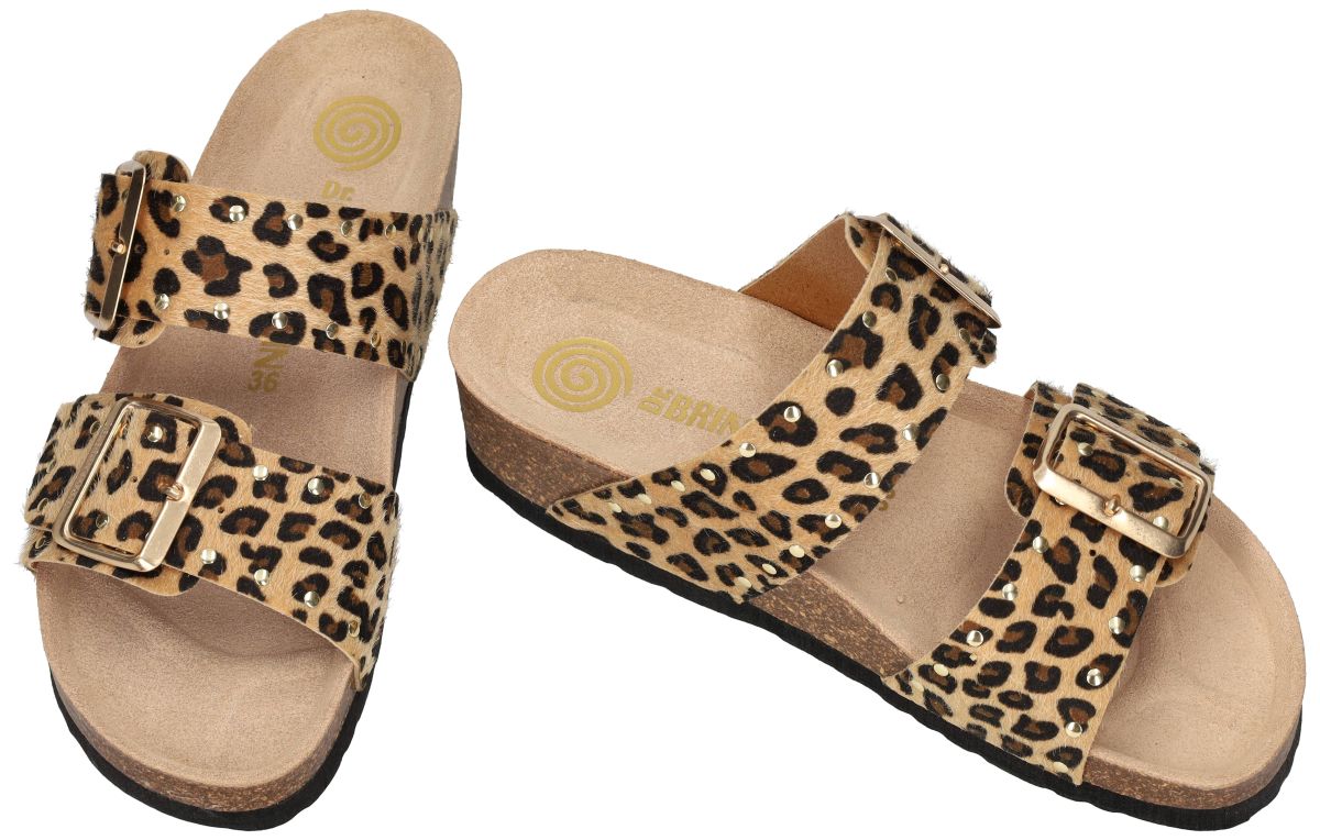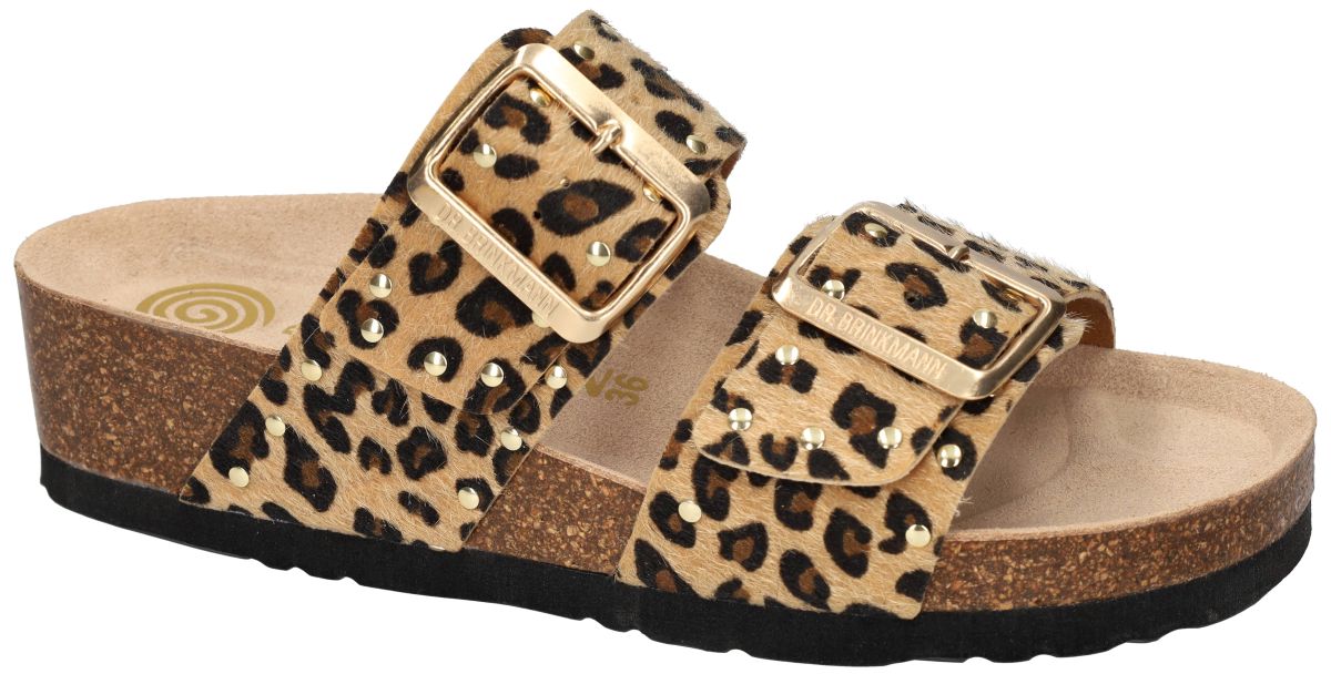 Deze modieuze damesslippers uit de nieuwe lente/zomer collectie van Dr. Brinkmann combineren een opvallend design met het vertrouwde comfort waarvoor het merk bekend staat. Het model Danaika/223 in de uitvoering Bright Leopard is een echte blikvanger dankzij zijn speelse dierenprint en elegante details. De upper is uitgevoerd in zacht ponyhair leder met luipaardprint, waarin warme tinten beige, camel en donkerbruin harmonieus samenkomen. Dit luxueuze bovenwerk wordt extra geaccentueerd door fijne koperen spijkerkopjes die subtiel over de banden zijn verdeeld en het geheel een modieuze, licht rock-chique uitstraling geven. De twee brede banden worden afgesloten met grote koperen gespen, waardoor de slipper niet alleen een karaktervolle look krijgt maar ook perfect verstelbaar is voor verschillende voettypes. Binnenin zorgt het typisch anatomisch gevormde voetbed van Dr. Brinkmann voor een aangenaam en gezond loopcomfort. Het voetbed beschikt over een tenengrijper, die het natuurlijke klauwreflex van de tenen stimuleert en zo de bloedcirculatie in de voeten bevordert. Daarnaast ondersteunt een verhoogde voetboogsteun de middenvoet, terwijl de diepe hielkuip de voet stabiel op zijn plaats houdt binnen het voetbed. De zoolopbouw is ontworpen voor dagelijks comfort. Onder het anatomische voetbed bevindt zich een schokabsorberende kurkzool met sleehak, die de hiel ongeveer 2 cm subtiel oplift voor een ontspannen houding tijdens het stappen. Onderaan zorgt een slijtvast PU-foam loopvlak voor een licht gewicht, goede demping en betrouwbare grip. Met hun modieuze luipaarddesign, comfortabele voetbed en praktische verstelbaarheid zijn deze Dr. Brinkmann Danaika/223 damesslippers ideaal voor zomerse dagen. Ze combineren moeiteloos met een luchtige jurk, linnen broek of casual jeans en vormen zo een stijlvolle en comfortabele keuze voor elke vrouw die graag mode en welzijn samenbrengt. Dr Brinkmann op wolkjes ! Dr BRINKMANN slippers, muiltjes en sandalen vindt men in onze schoenenwinkel regio Aalst, Ninove, Geraardsbergen, Zottegem, Liedekerke of kan men online bestellen op onze webshop.