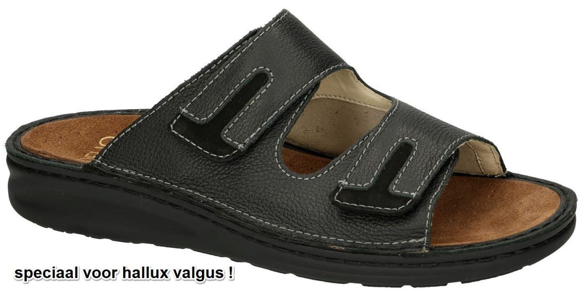 FIDELIO austrian design artikel/model 366031 HALLUX HANNO H½ 10 schwarz g-nappa/nubuk zijn herenschoenen zwarte lederen comfort slipper pantoffels van de Oostenrijkse schoenenfabrikant Fidelio. Deze functionele en praktische mannenslippers of sloffen hebben een extra brede H½-leest en verstelbare of aanpasbare klittenbandsluitingen + extra rekbaar stretch inzet ter hoogte van de hallux valgus. Deze Fidelio Hanno slippers zijn binnenin bekleed met aangenaam aanvoelend mals kalfsleder. Het anatomisch voorgevormd voetbed is vervaardigd uit schokbestendig en veerkrachtig kurk bekleed met zacht nubuckleder. Door de diepe kuip in de zool kan het voetbed kan worden vervangen door eigen steunzolen. Hoogkwalitatieve orthopedische herensandaal aan betaalbare prijs. Fidelio comfort heren slippers en pantoffels kan men kopen in onze schoenenwinkel regio Aalst, Ninove, Geraardsbergen, Zottegem of online bestellen op onze webshop. Is uw maat niet voorradig? Contacteer ons en we trachten u alsnog te helpen.