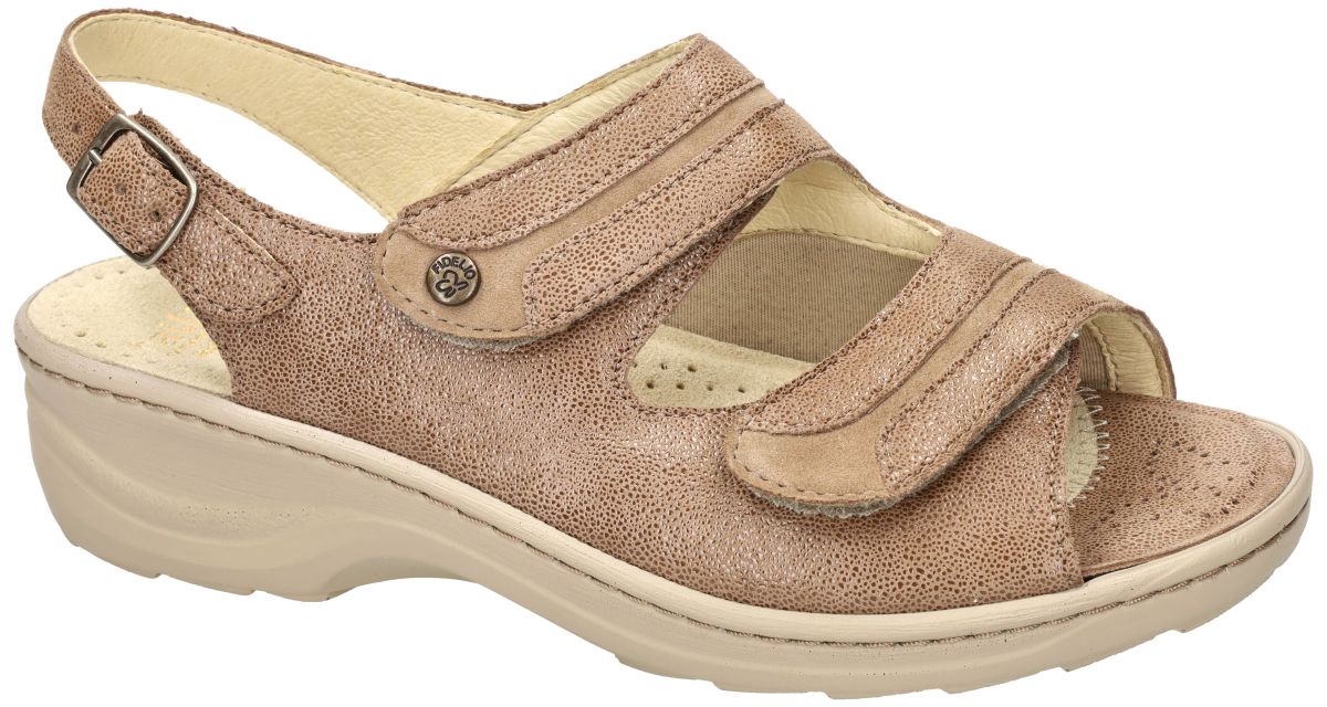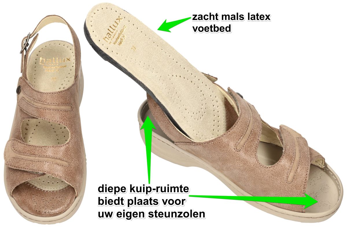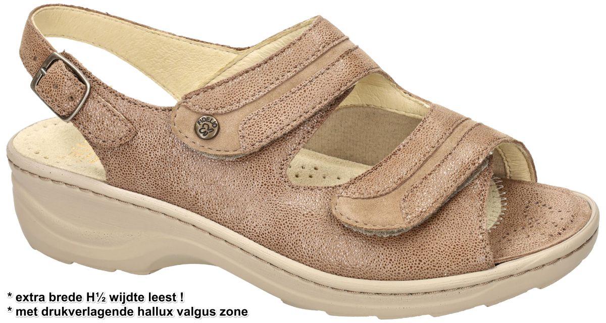 FIDELIO artikel/model 236024 HALLUX HEDI (H½) 94 Umbra Theo/Nubi zijn licht bruine met fijne schuimprint nubuck/suède medisch orthopedische Hallux Valgus sandalen van het Oostenrijkse schoenenmerk FIDELIO. Deze super comfortabele Fidelio Hallux dames sandalen hebben een hak van 3 cm en een extra brede H½ wijdte leest voor brede tot zeer brede voeten. Ter hoogte van de hallux valgus (grote teen) is een zacht strechleder inzetstuk voorzien ompijnlijke druk op deze plaats te voorkomen. Fidelio hallux sandalen zijn voorzien van een dik uitneembare hallux mals latex voetbed bekleed met nubuck. Deze geïntegreerde steunzool is speciaal in samenwerking met orthopedisten ontworpen om de druk op de hallux valgus te verlichten. Uiteraard is het mogelijk om dit los voetbed te vervangen door uw eigen steunzolen. Fidelio Hallux schoenen en sandalen vindt men in onze schoenenwinkel regio Aalst, Ninove, Geraardsbergen, Liedekerke of kan men online bestellen op onze webshop.