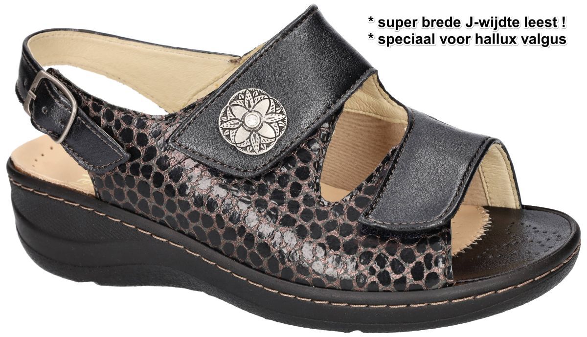 Geniet van optimaal comfort en onmiskenbare stijl met deze Fidelio Hallux Jessy versie 25 schwarz kombi sandalen, uitgevoerd in zwart glossy leder gecombineerd met een fijne taupe metallic giraf-print. Deze elegant ontworpen sandalen zijn ideaal voor dames met brede voeten en voorzien van specifieke eigenschappen die tegemoetkomen aan de behoeften bij hallux valgus. De super brede J-wijdte leest biedt ruime pasvorm, terwijl de glanzend zwarte kleur met subtiele dierprint een modieuze flair toevoegt die bij elke outfit past. Bijzonder comfortabel zijn de rekbare stretchzones die speciaal zijn ontworpen om de druk op gevoelige hallux valgus gewrichten te verlichten. De zwarte/taupe glans combineert moeiteloos met diverse kleurenpaletten, terwijl de sierlijke bloemgesp niet alleen een charmant detail is, maar ook functionaliteit biedt voor een verstelbare pasvorm. Voor diegenen die eigen steunzolen gebruiken, is er de diepe kuip-ruimte in het voetbed die personalisatie en orthopedisch gebruik mogelijk maakt. Het anatomisch gevormde kurken voetbed van de sandalen, een steunzool op zichzelf, biedt natuurlijke ondersteuning en draagt bij aan het verminderen van vermoeidheid in de voeten. Het beige lederen voetbed verhoogt het comfort met zijn zachte en ademende eigenschappen. Deze zwarte Fidelio Hallux Jessy sandalen met luipaardprint zijn voorzien van een subtiele hak en een zwarte zool die demping en stabiliteit bieden. Ze zijn de perfecte match voor de modebewuste vrouw die geen concessies wil doen aan comfort. Of het nu voor dagelijkse bezigheden is of voor een avondje uit, deze sandalen bieden een perfecte balans tussen gezondheid, comfort en stijl. Fidelio Hallux schoenen en sandalen vindt men in onze schoenenwinkel regio Aalst, Ninove, Geraardsbergen, Liedekerke of kan men online bestellen op onze webshop.