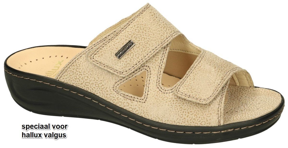 HALLUX by FIDELIO artikel/model 434113 HALLUX FABIA F½ 23 Sesame Theo zijn beige met fijne luipaard vlekjes print damesschoenen medisch orthopedische Hallux Valgus slippers of muil pantoffels van het Oostenrijkse schoenenmerk FIDELIO HALLUX. Deze super comfortabele Fidelio Hallux damesslipper heeft hak 3 cm en een F1/2 wijdte leest voor normaal tot de wat bredere voeten (F tot G). Fidelio slippers zijn voorzien van een dik uitneembare hallux steunzool vervaardigd van schokabsorberend kurk en met leder bekleed. Deze anatomisch gevormd geïntegreerde steunzool is speciaal in samenwerking met orthopedisten ontworpen om de druk op de hallux valgus te verlichten. Uiteraard is het mogelijk om dit los voetbed te vervangen door uw eigen steunzolen. Ter hoogte van de hallux valgus (grote teen) is een zacht strechleder inzetstuk voorzien ompijnlijke druk op deze plaats te voorkomen. Fidelio Hallux schoenen en slippers vindt men in onze schoenenwinkel regio Aalst, Ninove, Geraardsbergen, Liedekerke of kan men online bestellen op onze webshop.