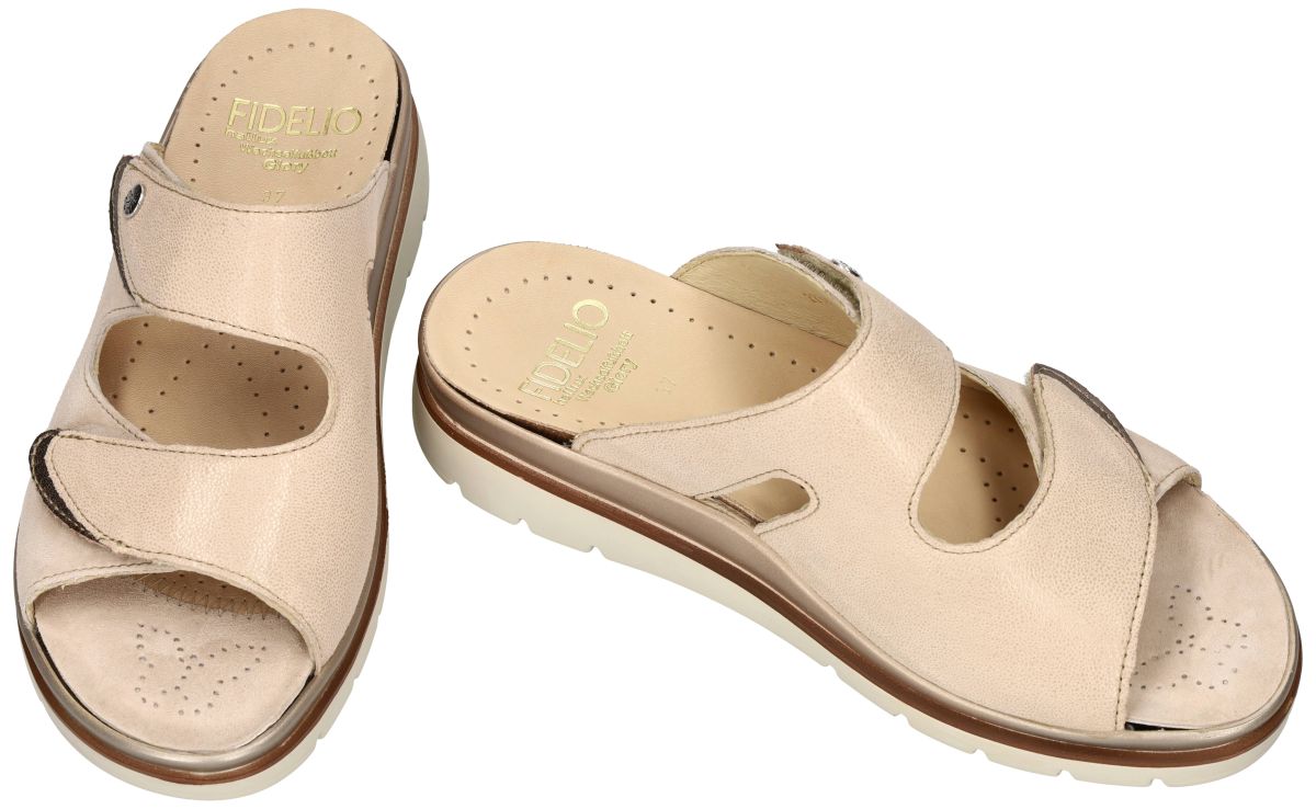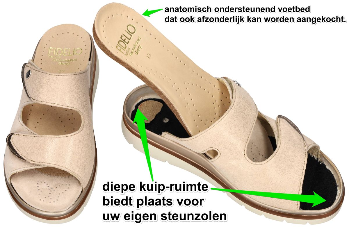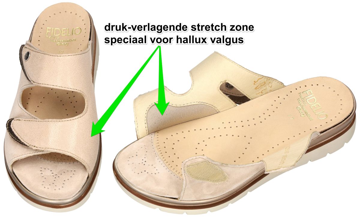 HALLUX by FIDELIO artikel/model 595020 HALLUX GLORY (G) 72 Cream Kombi zijn beige nubuck/velour damesschoenen medisch orthopedische Hallux Valgus slippers of muil pantoffels van het Oostenrijkse schoenenmerk FIDELIO HALLUX. Deze super comfortabele Fidelio Hallux damesslipper heeft een gelaagde plateauzool met 2 cm reële hielhoogte en een brede G½ wijdte leest voor de wat bredere en zware voeten. Fidelio slippers zijn voorzien van een dik uitneembare hallux steunzool vervaardigd van schokabsorberend kurk en met velour bekleed. Deze anatomisch gevormd geïntegreerde steunzool is speciaal in samenwerking met orthopedisten ontworpen om de druk op de hallux valgus te verlichten. Uiteraard is het mogelijk om dit los voetbed te vervangen door uw eigen steunzolen. Ter hoogte van de hallux valgus (grote teen) is een zacht strechleder inzetstuk voorzien ompijnlijke druk op deze plaats te voorkomen. Fidelio Hallux schoenen en slippers vindt men in onze schoenenwinkel regio Aalst, Ninove, Geraardsbergen, Liedekerke of kan men online bestellen op onze webshop.
