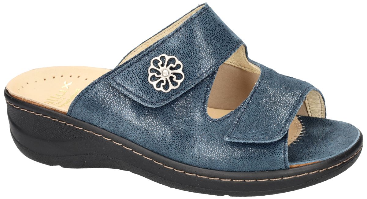 HALLUX by FIDELIO artikel/model 456005 JESSY (J) 19 Marine Miss zijn super brede blauwe nubuck met een fijn grindsteen patroon damesschoenen medisch orthopedische Hallux Valgus slipper of muil pantoffel van het Oostenrijkse schoenenmerk FIDELIO HALLUX. Deze super brede comfortabele Fidelio Hallux damesslipper heeft hak 3 cm en een extra brede J wijdte leest voor zeer brede en dikke of gezwollen voeten. De Jessy J slipper van Fidelio Hallux is voorzien van een zachte stretch-zone ter hoogte van de hallux. Eveneens geschikt voor diabetes, revalidatie, en obesitas patiënten. Deze Fidelio hallux slippers zijn voorzien van een dik uitneembare hallux-steunzool vervaardigd uit schokbestendig en veerkrachtig kurk met leder bekleed. Deze geïntegreerde steunzool is speciaal in samenwerking met orthopedisten ontworpen om de druk op de hallux valgus te verlichten. Uiteraard is het mogelijk om dit los voetbed te vervangen door uw eigen steunzolen. Dit voetbed kan ook afzonderlijk aangekocht worden. Ter hoogte van de hallux valgus (grote teen) is een zacht strechleder inzetstuk voorzien om pijnlijke druk op deze plaats te voorkomen. Fidelio Hallux schoenen, sandalen en slippers kan men aanschaffen in onze schoenenwinkel regio Aalst, Ninove, Geraardsbergen, Zottegem, Liedekerke of online bestellen op onze webshop.