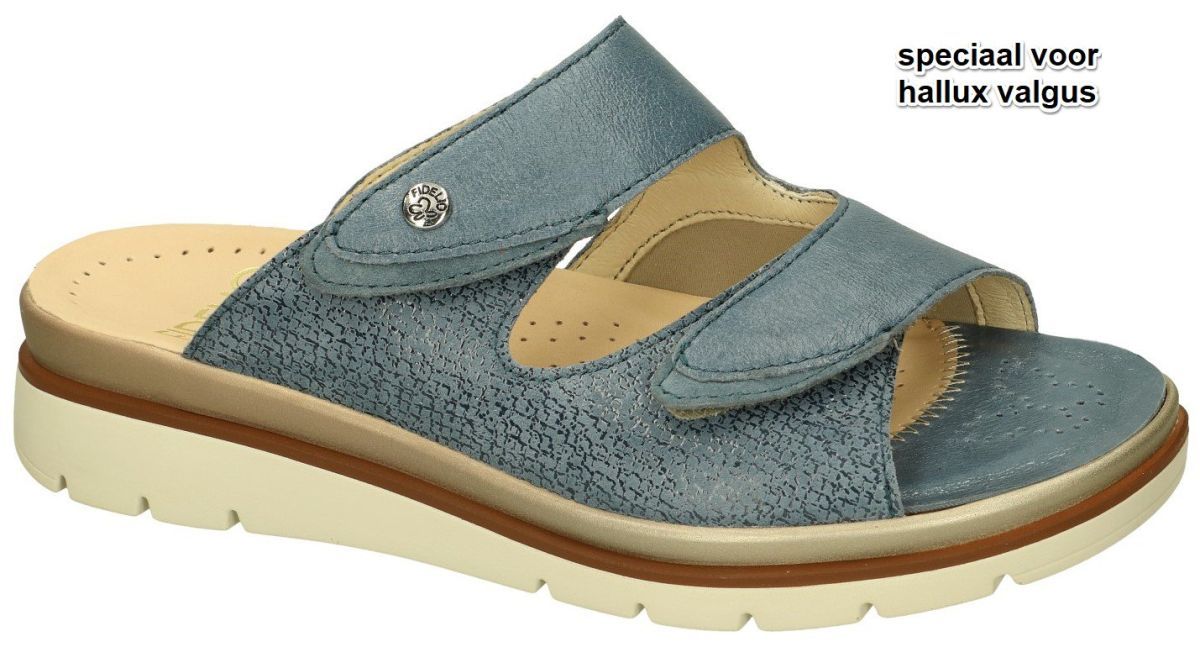 HALLUX by FIDELIO artikel/model 595020 HALLUX GLORY (G) 29 Royal Corny/Float zijn jeansblauwe leder + nubuck damesschoenen medisch orthopedische Hallux Valgus slippers of muil pantoffels van het Oostenrijkse schoenenmerk FIDELIO HALLUX. Deze super comfortabele Fidelio Hallux damesslipper heeft een gelaagde plateauzool met 2 cm reële hielhoogte en een brede G½ wijdte leest voor de wat brede en zware voeten. Fidelio slippers zijn voorzien van een dik uitneembare hallux steunzool vervaardigd van schokabsorberend kurk en met leder bekleed. Deze anatomisch gevormd geïntegreerde steunzool is speciaal in samenwerking met orthopedisten ontworpen om de druk op de hallux valgus te verlichten. Uiteraard is het mogelijk om dit los voetbed te vervangen door uw eigen steunzolen. Ter hoogte van de hallux valgus (grote teen) is een zacht strechleder inzetstuk voorzien ompijnlijke druk op deze plaats te voorkomen. Fidelio Hallux schoenen en slippers vindt men in onze schoenenwinkel regio Aalst, Ninove, Geraardsbergen, Liedekerke of kan men online bestellen op onze webshop.