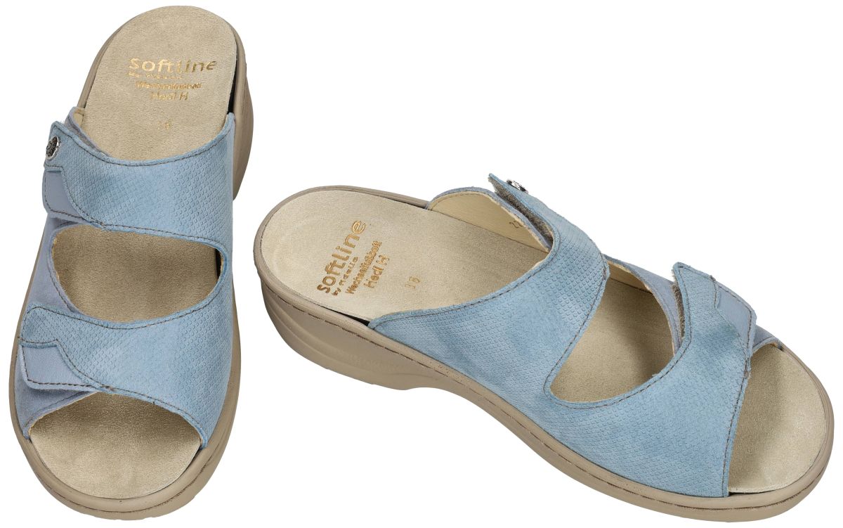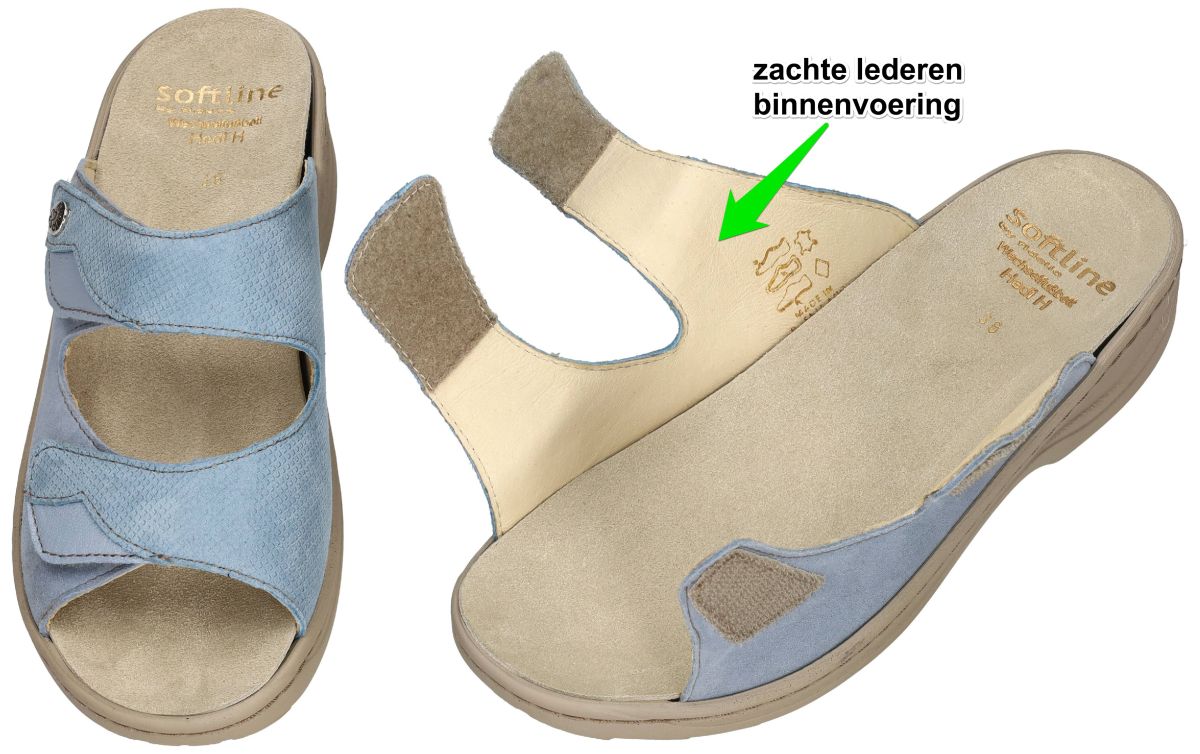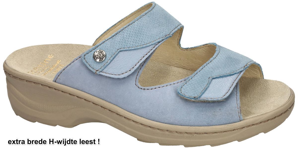 Soft-Line by FIDELIO artikel/model 234013 Soft-Line HEDI (H) 49 Oceania Kombi zijn lichtblauwe (hemelsblauw of babyblue) damesschoenen slippers of muil pantoffels uit de Softline collectie van het Oostenrijkse schoenenmerk FIDELIO. Deze super comfortabele Fidelio HEDI damesslipper staan op een schokabsorberende anti-slip-zool en heeft een aangenaam aanvoelende lederen binnenvoering en heeft hak 3 cm en een extra brede H-wijdte leest voor brede en volumineuze voeten. Deze Fidelio softline Hedi slippers kan men makkelijk door de twee klittenbandsluitingen aanpassen aan uw voet en zijn voorzien van een dik uitneembare veerkrachtig en schokdempend latex voetbed met zacht nubuckleder bekleed. Uiteraard is het mogelijk om dit los voetbed te vervangen door uw eigen steunzolen. Comfortabele hoogkwaliteit slippers voor dagelijks gebruik aan een democratische prijs. Fidelio Hallux schoenen en slippers vindt men in onze schoenenwinkel regio Aalst, Ninove, Geraardsbergen, Liedekerke of kan men online bestellen op onze webshop.