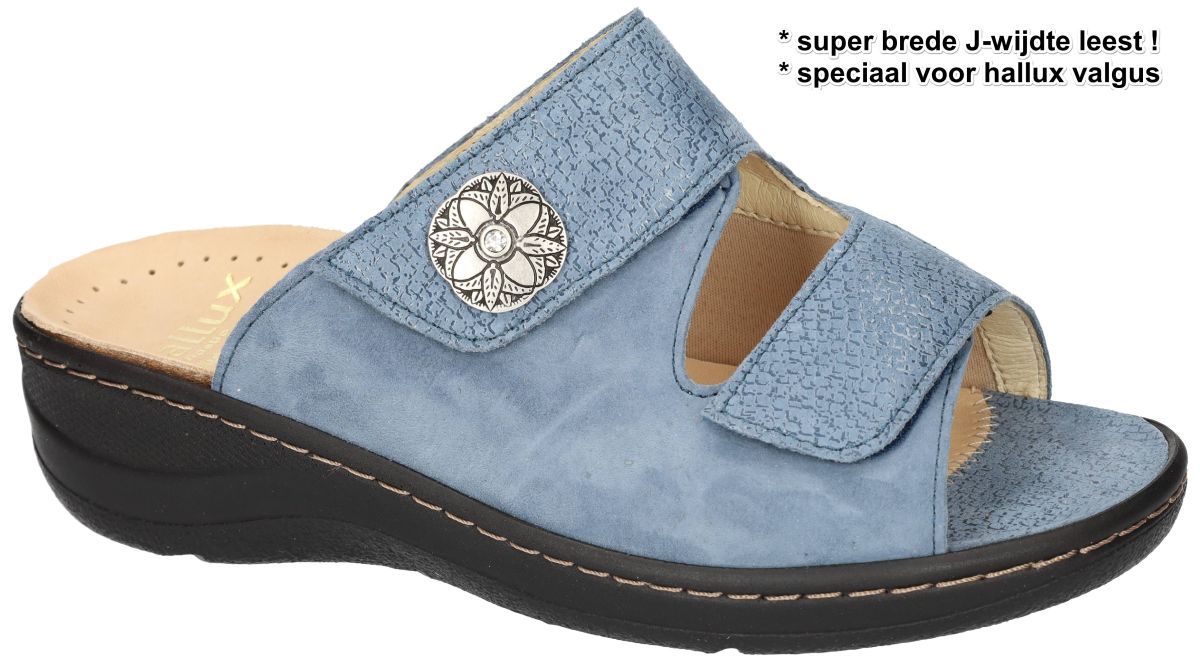 HALLUX by FIDELIO artikel/model 456003 JESSY (J) 85 Royal Kombi zijn super brede lichtblauwe (hemelsblauw of jeansblauw) nubuck met vlekken-print damesschoenen medisch orthopedische Hallux Valgus slippers of muil pantoffels van het Oostenrijkse schoenenmerk FIDELIO HALLUX. Deze super brede comfortabele Fidelio Hallux damesslipper heeft hak 3 cm en een extra brede J wijdte leest voor zeer brede en dikke of gezwollen voeten. Eveneens geschikt voor diabetes, revalidatie, en obesitas patiënten. Deze Fidelio hallux slippers zijn voorzien van een dik uitneembare hallux-steunzool vervaardigd uit schokbestendig en veerkrachtig kurk met leder bekleed. Deze geïntegreerde steunzool is speciaal in samenwerking met orthopedisten ontworpen om de druk op de hallux valgus te verlichten. Uiteraard is het mogelijk om dit los voetbed te vervangen door uw eigen steunzolen. Ter hoogte van de hallux valgus (grote teen) is een zacht strechleder inzetstuk voorzien om pijnlijke druk op deze plaats te voorkomen. Fidelio Hallux schoenen, sandalen en slippers kan men aanschaffen in onze schoenenwinkel regio Aalst, Ninove, Geraardsbergen, Zottegem, Liedekerke of online bestellen op onze webshop.