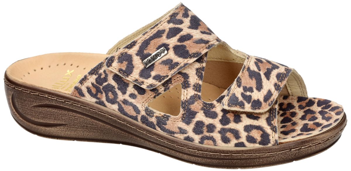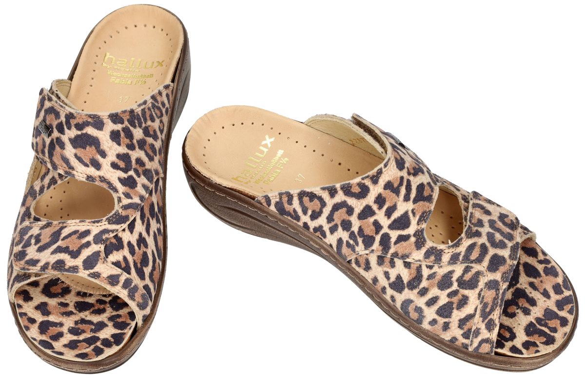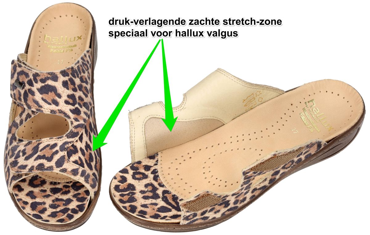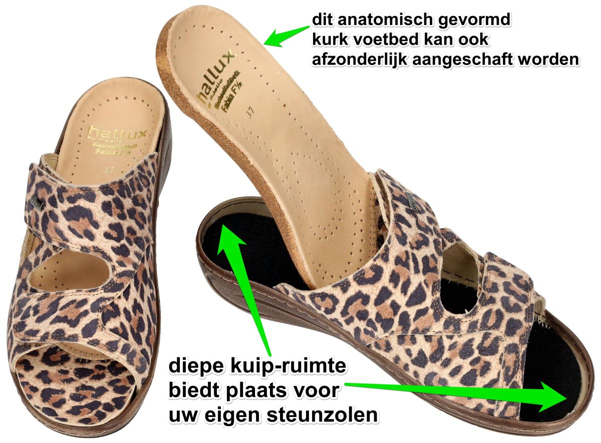 HALLUX by FIDELIO artikel/model 434133 HALLUX FABIA F½ 53 Cremoso Lesoto zijn nubuck leder met een luipaard print damesschoenen medisch orthopedische Hallux Valgus slippers of muil pantoffels van het Oostenrijkse schoenenmerk FIDELIO HALLUX. Deze super comfortabele Fidelio Hallux damesslipper heeft hak 3 cm en een F1/2 wijdte leest voor normaal tot de wat bredere voeten (F tot G). Fidelio slippers zijn voorzien van een dik uitneembare hallux steunzool vervaardigd van schokabsorberend kurk en met leder bekleed. Deze anatomisch gevormd geïntegreerde steunzool is speciaal in samenwerking met orthopedisten ontworpen om de druk op de hallux valgus te verlichten. Dit speciale voetbed kan ook apart worden aangeschaft om uw slippers eens te vernieuwen en op te frissen. Uiteraard is het mogelijk om dit los voetbed te vervangen door uw eigen steunzolen. Ter hoogte van de hallux valgus (grote teen) is een zachte drukverlagende strechleder zone ingebouwd om pijnlijke druk op deze plaats te voorkomen. Fidelio Hallux schoenen en slippers vindt men in onze schoenenwinkel regio Aalst, Ninove, Geraardsbergen, Liedekerke of kan men online bestellen op onze webshop.