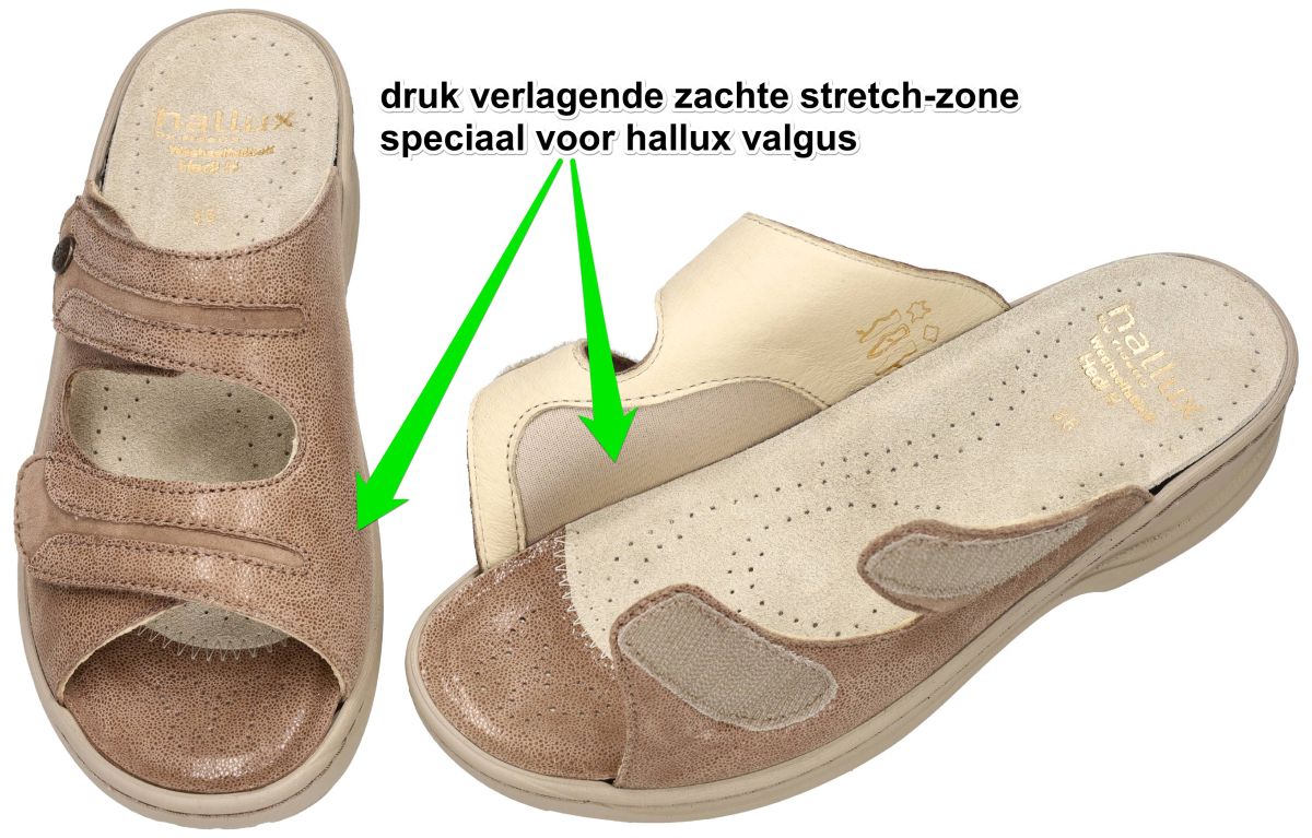 HALLUX by FIDELIO artikel/model 236023 HALLUX HEDI H 94 Ambra Miss/Nubi zijn extra brede taupe (donker-beige) glinsternubuck damesschoenen medisch orthopedische Hallux Valgus slippers of muil pantoffes van het Oostenrijkse schoenenmerk FIDELIO HALLUX. Deze super comfortabele Fidelio Hallux damesslipper zijn uitgevoerd in een zeer mooi glinsterend taupe-bruin nubuck en heeft hak 3 cm en een EXTRA BREDE H½-wijdte leest voor de wat bredere en volumineuze voeten. Deze Fidelio hallux slippers zijn voorzien van een dik uitneembare hallux steunzool vervaardigd uit zacht mals latex rubber en met nubuckleder bekleed. Deze geïntegreerde steunzool is speciaal in samenwerking met orthopedisten ontworpen om de druk op de hallux valgus te verlichten. Uiteraard is het ook mogelijk om dit los voetbed te vervangen door uw eigen op maat gemaakte steunzolen. Ter hoogte van de hallux valgus (grote teen) is een drukverlagend zacht strechleder inzetstuk voorzien om pijnlijke druk op deze plaats te voorkomen. Fidelio Hallux schoenen en slippers vindt men in onze schoenenwinkel regio Aalst, Ninove, Geraardsbergen, Liedekerke of kan men online bestellen op onze webshop.