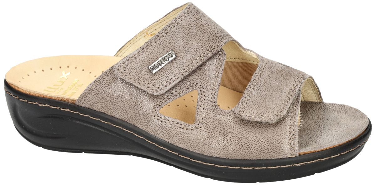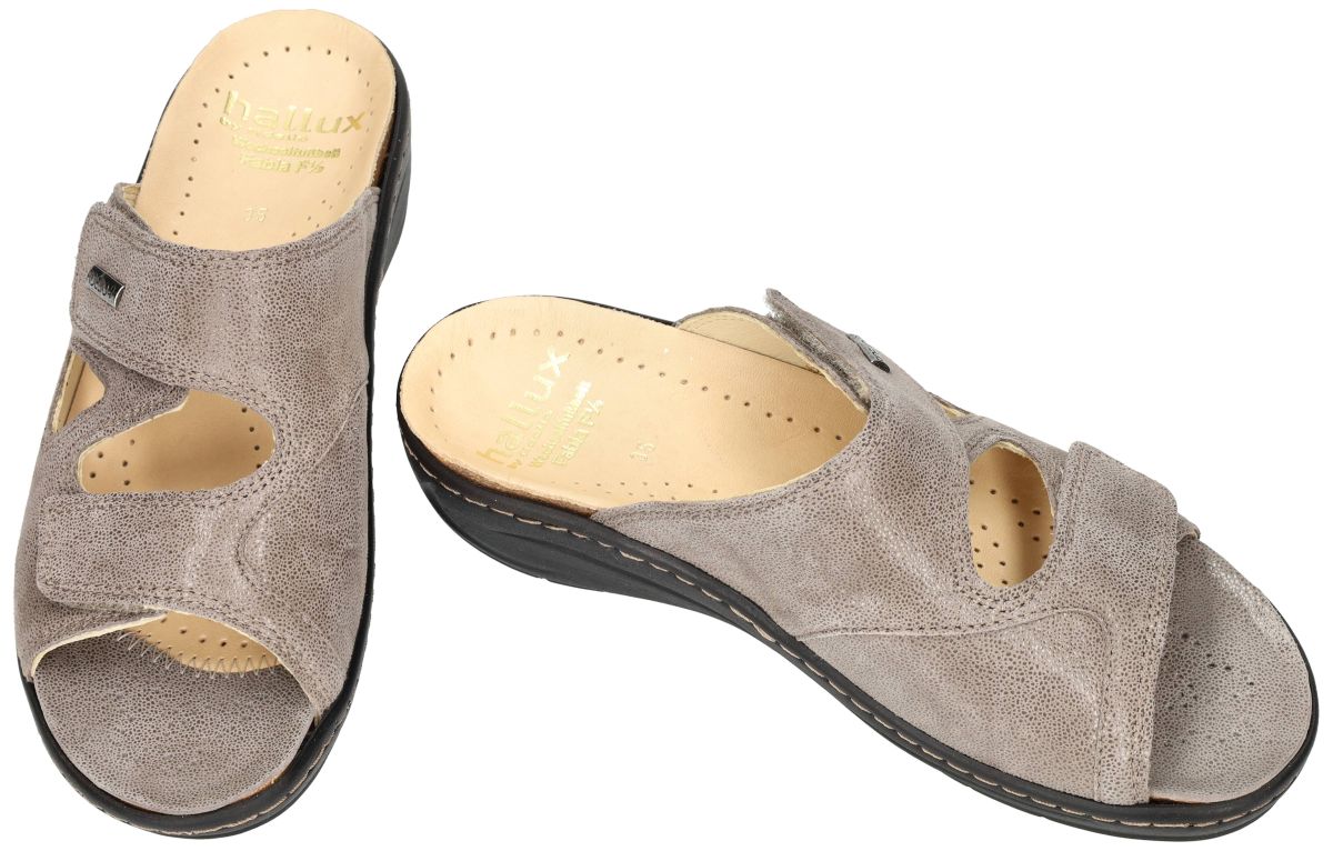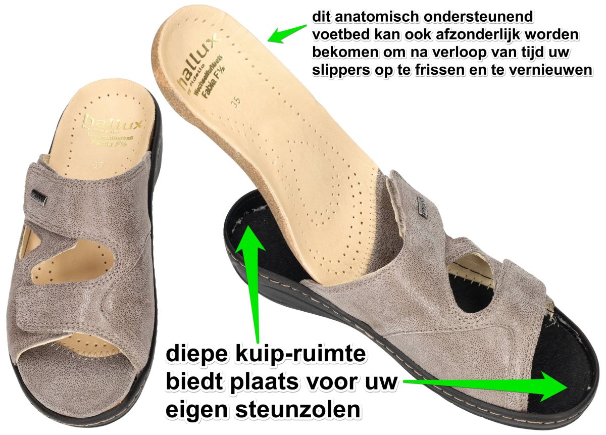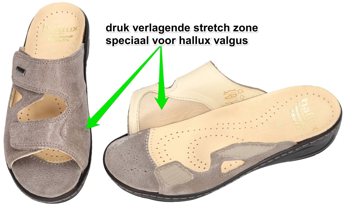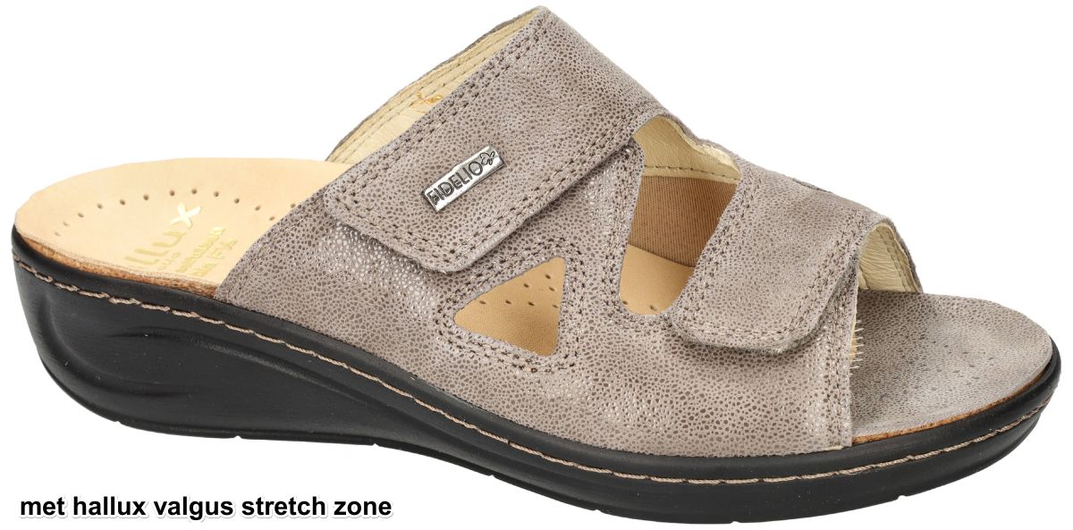 HALLUX by FIDELIO artikel/model 434133 HALLUX FABIA F½ 58 Umbra Miss zijn taupe nubuck leder met een fijne schuimprint damesschoenen medisch orthopedische Hallux Valgus slippers of muil pantoffels van het Oostenrijkse schoenenmerk FIDELIO HALLUX. Deze super comfortabele Fidelio Hallux damesslipper heeft hak 3 cm en een F1/2 wijdte leest voor normaal tot de wat bredere voeten (F tot G). Ter hoogte van de hallux valgus (grote teen) is een zachte drukverlagende strechleder zone ingebouwd om pijnlijke druk op deze plaats te voorkomen. Fidelio slippers zijn voorzien van een dik uitneembare hallux steunzool vervaardigd van schokabsorberend kurk en met leder bekleed. Deze anatomisch gevormd geïntegreerde steunzool is speciaal in samenwerking met orthopedisten ontworpen om de druk op de hallux valgus te verlichten. Fidelio Hallux schoenen en slippers vindt men in onze schoenenwinkel regio Aalst, Ninove, Geraardsbergen, Zottegem, Liedekerke of kan men online bestellen op onze webshop.